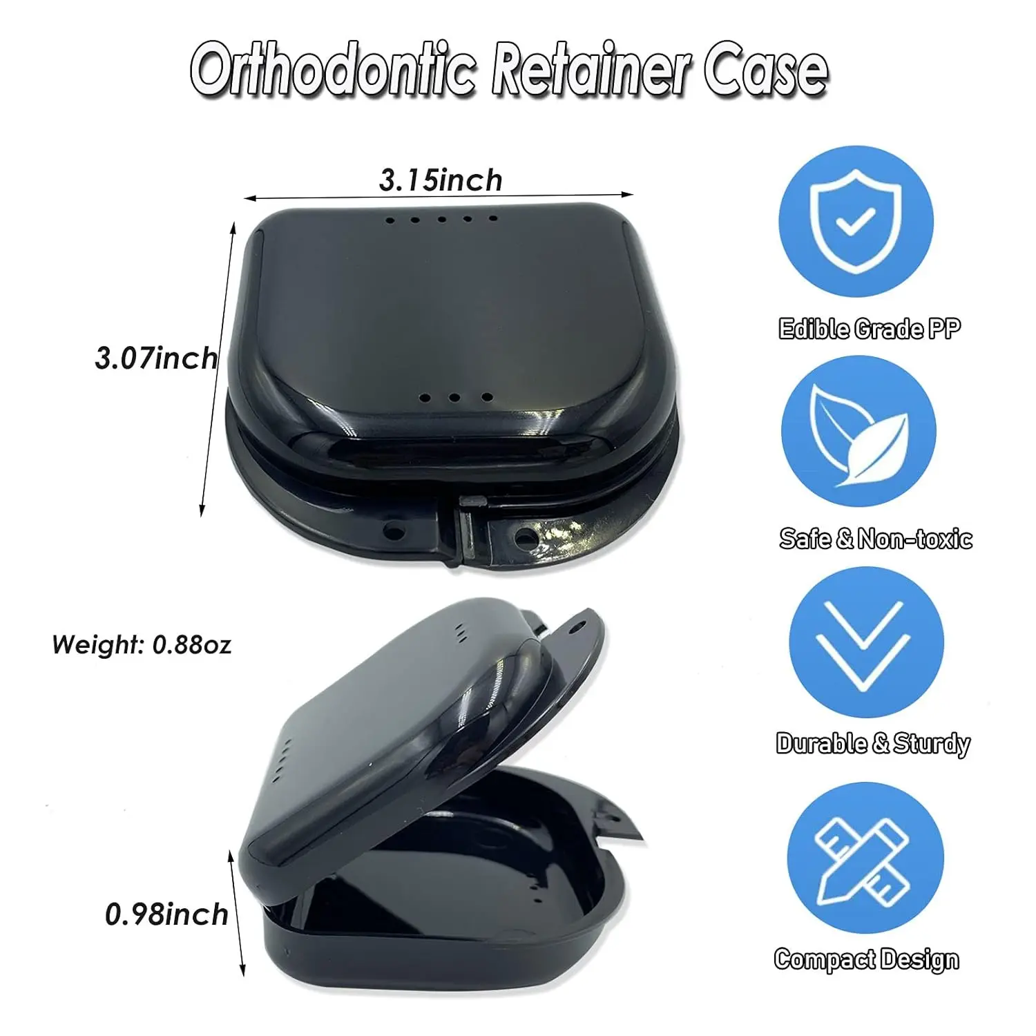 This black Orthodontic Retainer Case features ventilation holes, a secure snap lock, and durable BPA-free plastic. Perfect for safely storing retainers, dentures, and mouthguards.