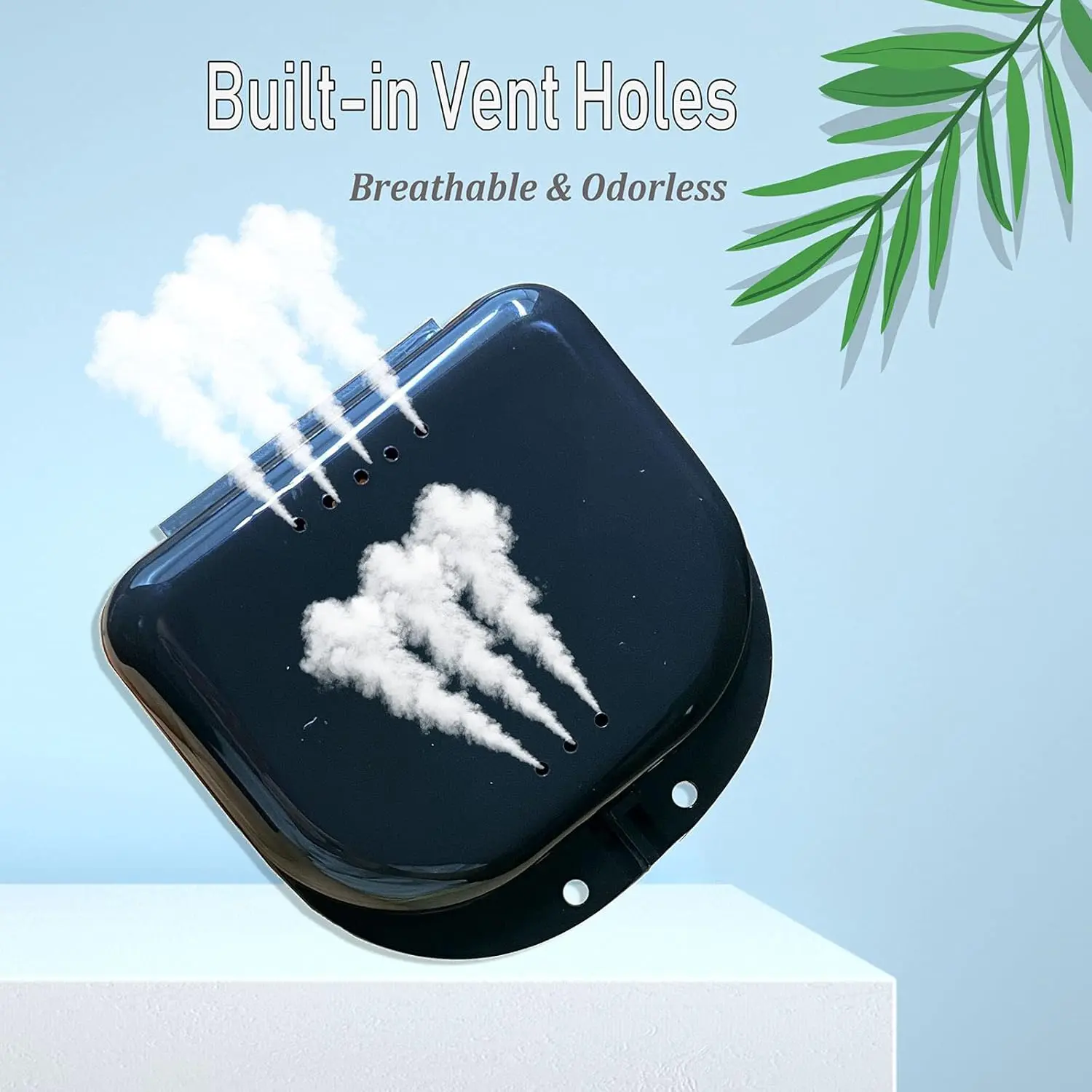 Keep your orthodontic retainers, dentures, mouth guards, and other oral appliances safe, clean, and organized with this Orthodontic Retainer Case. Designed for daily use, this case provides a secure and hygienic storage solution for your valuable dental devices. The built-in ventilation system, featuring two rows of strategically placed ventilation holes on both the front and back, allows for continuous airflow. This vital feature helps keep your oral appliance dry, preventing the growth of bacteria and eliminating unpleasant odors.