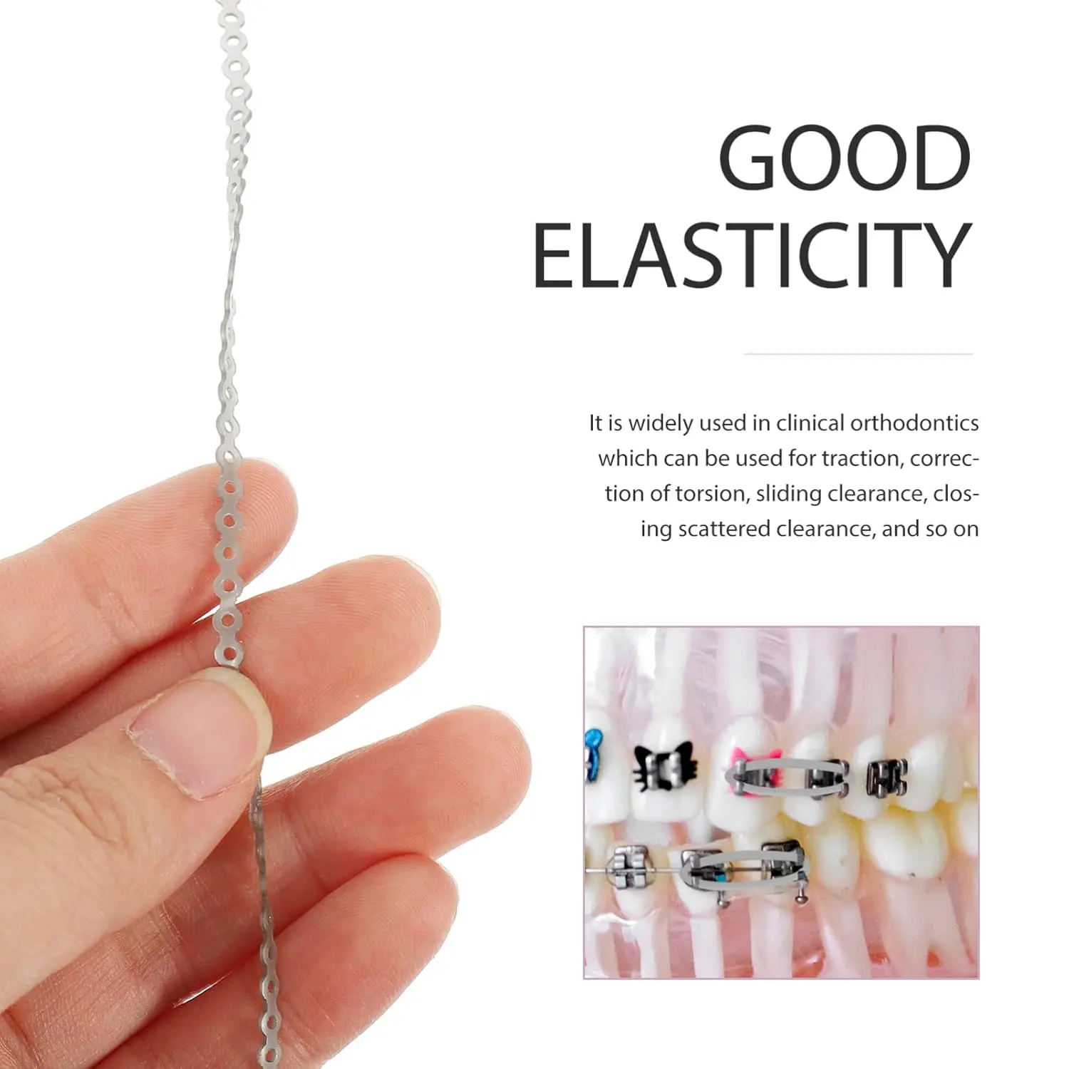 Continuous elastic chain for braces, delivering consistent orthodontic traction. Made from durable rubber, ideal for home, hospital, and dental clinic use. Helps maintain teeth alignment.