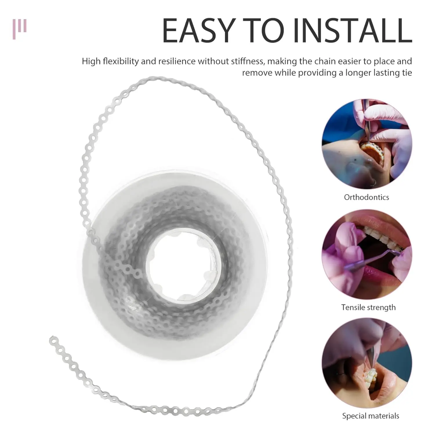 The continuous design provides flexibility and adaptability, enabling you to customize the length and tension of the elastic chain to meet your specific needs. This level of customization ensures a comfortable and effective fit, maximizing the benefits of your orthodontic treatment.