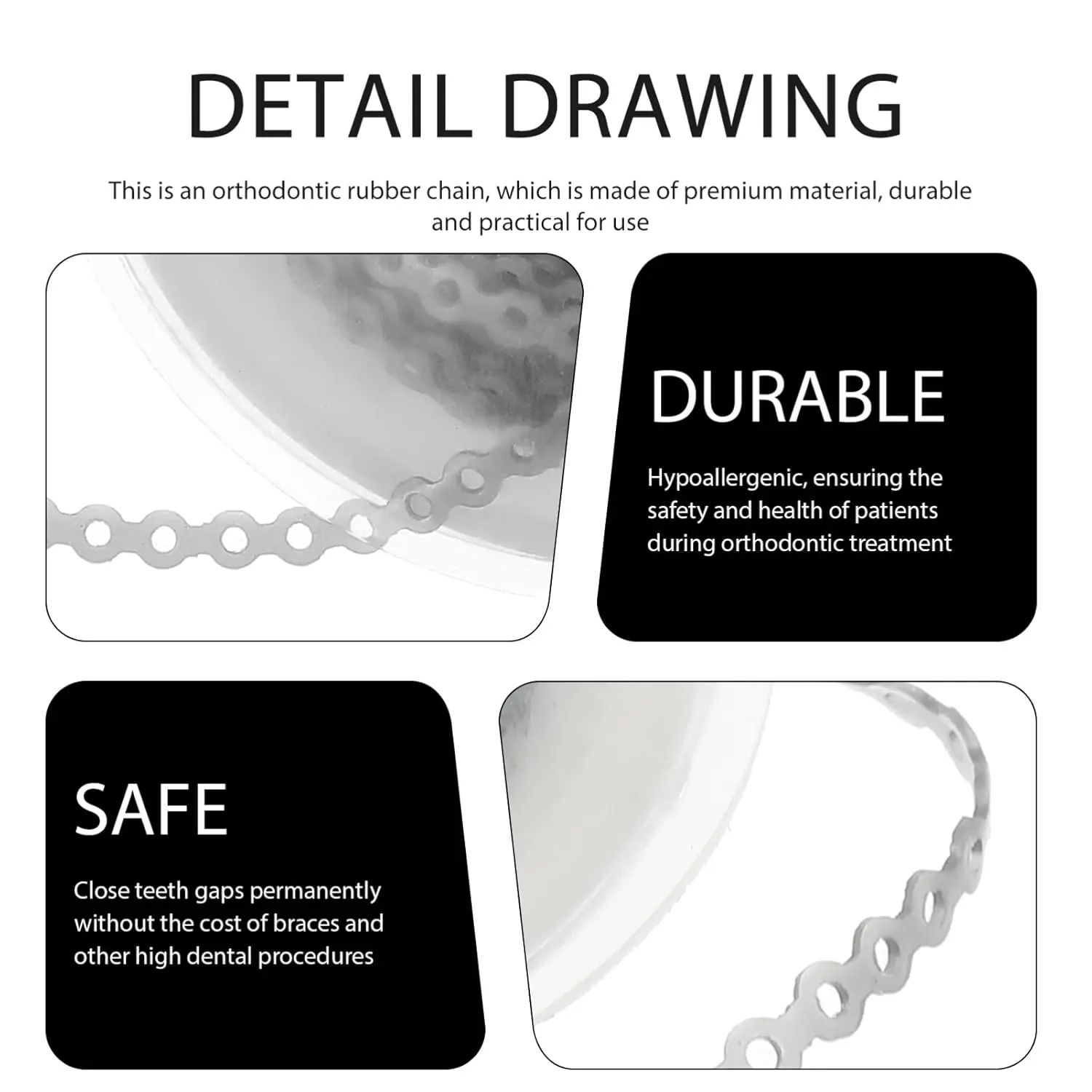 Made from high-quality rubber material, this elastic band is both durable and reliable. It can withstand the stresses of daily wear and tear, ensuring that it maintains its elasticity and effectiveness over time. The chain’s design also helps to prevent deformation, ensuring that it continues to provide consistent support throughout your treatment.
