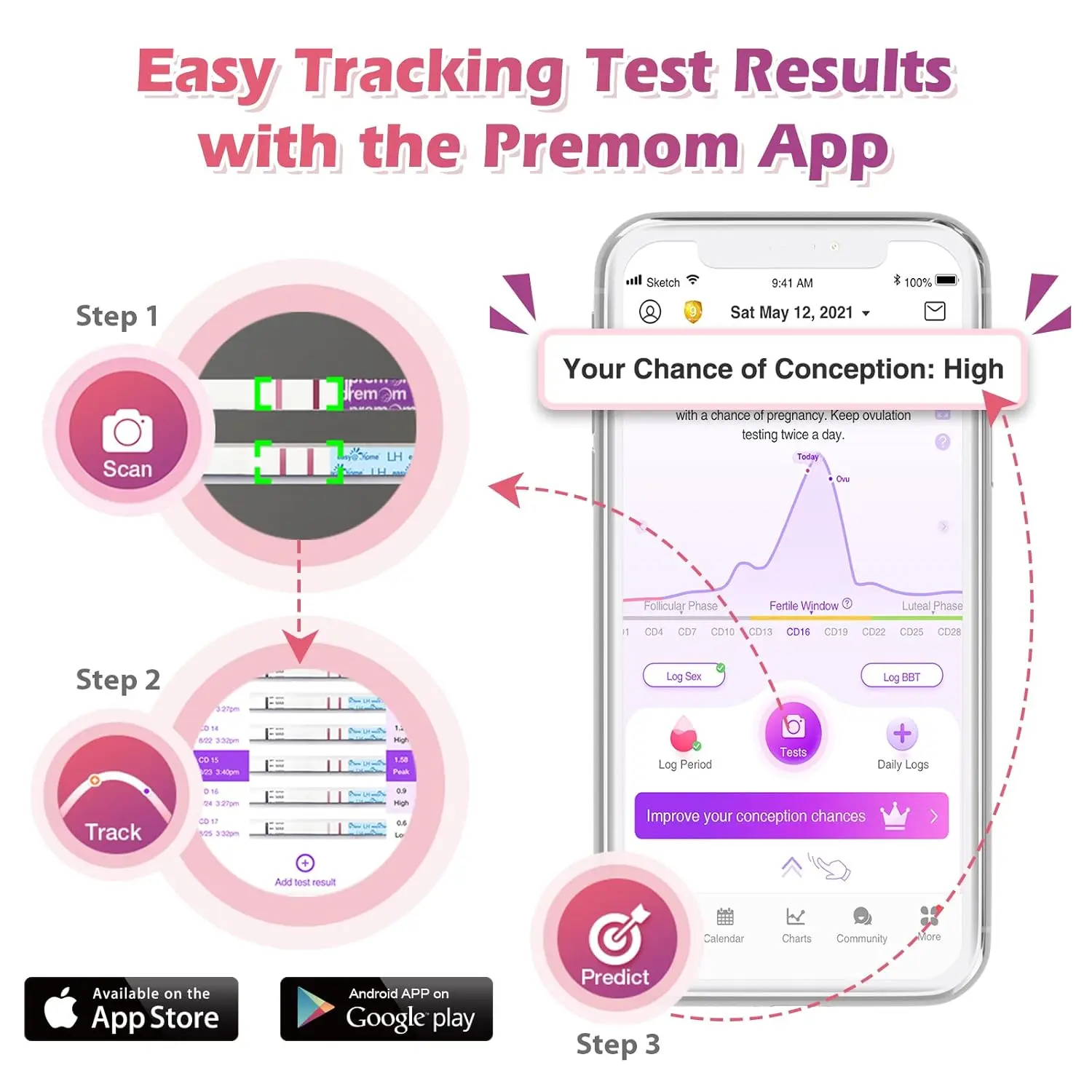 • Comprehensive TTC kit: 50 LH tests, 20 HCG tests, digital basal thermometer, and 70 urine cups.