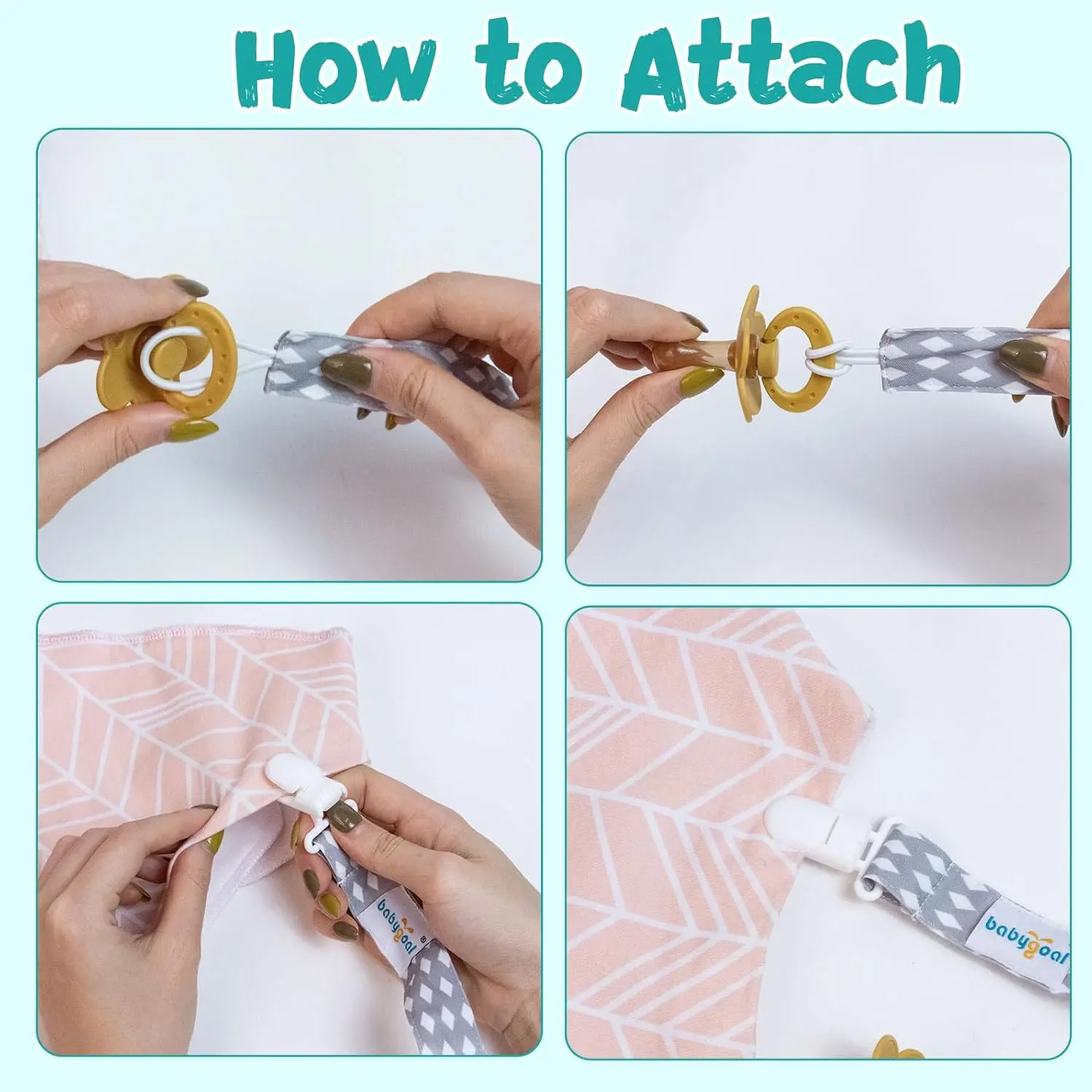 Keep your baby’s pacifier clean, secure, and always within reach with our stylish and versatile Pacifier Clips! This set is designed to fit all pacifier styles with a ring attachment, offering a universal solution for your little one’s soothing needs. Made from high-quality, durable polyester fabric, these leashes are soft, washable, and built to last. The all-in-one clips feature safe plastic teeth that provide a secure hold without damaging delicate clothing. Rest assured, our pacifier clips are BPA Free, Phthalate Free, Latex Free, and Lead Free, making them safe for babies of all ages. Choose from a wide variety of unique designs, including solid colors, adorable animals, vibrant flowers, and festive Halloween and Christmas themes. More than just pacifier holders, these leashes can also be used for soothies, teethers, burp cloths, teething rings, blankets, and drool bibs. With a one-year guarantee and customer satisfaction as our top priority, you can trust Babygoal Pacifier Clips to provide a reliable and stylish solution for your baby’s needs. Say goodbye to lost pacifiers and hello to convenience and peace of mind! The secure plastic teeth clip onto clothing tightly, but are gentle enough to not leave harsh marks or damage clothing. The variety of adorable designs are great for both boy and girl babies and are sure to be the perfect accent to any outfit or occasion!