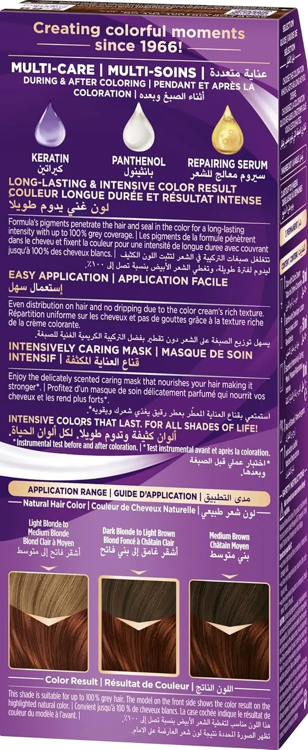 Achieve stunning, long-lasting hair color with Palette Middle Chestnut Hair Color Creme. This advanced formula delivers intense, vibrant color that resists fading, keeping your hair looking beautiful for weeks. Our unique color-seal technology locks in pigments, providing anti-fade protection and ensuring your chestnut shade stays rich and true. Experience extra care throughout the coloring process with our 3X Care system. Enriched with Keratin, Panthenol, and Nutri-oil, this creme not only provides exceptional color but also nourishes and strengthens your hair, leaving it feeling soft, smooth, and healthy. Say goodbye to greys with our perfect grey coverage, ensuring a flawless, even result from root to tip. Palette Middle Chestnut Hair Color Creme offers a salon-quality experience in the comfort of your own home, providing vibrant, long-lasting color and comprehensive hair care. Trust Palette for a beautiful, confident you.