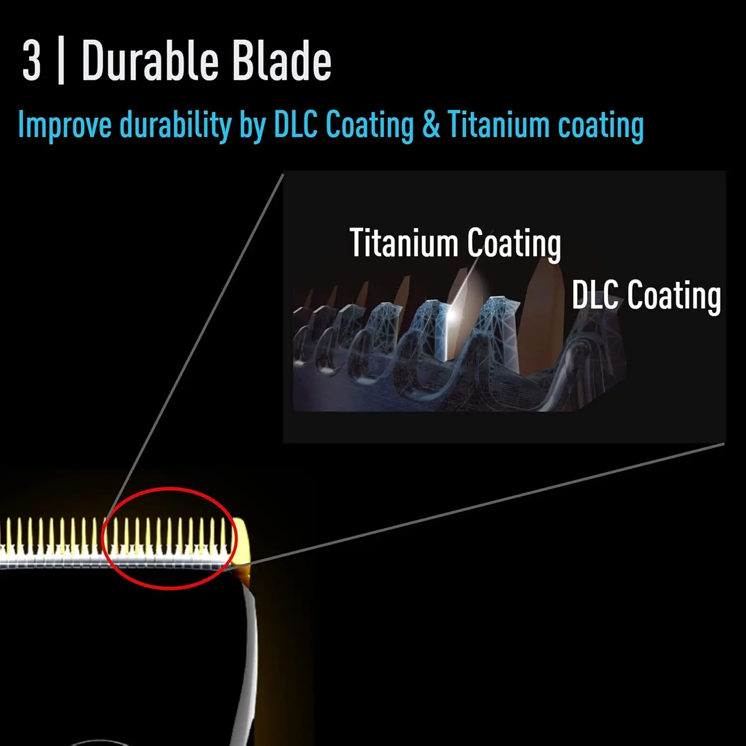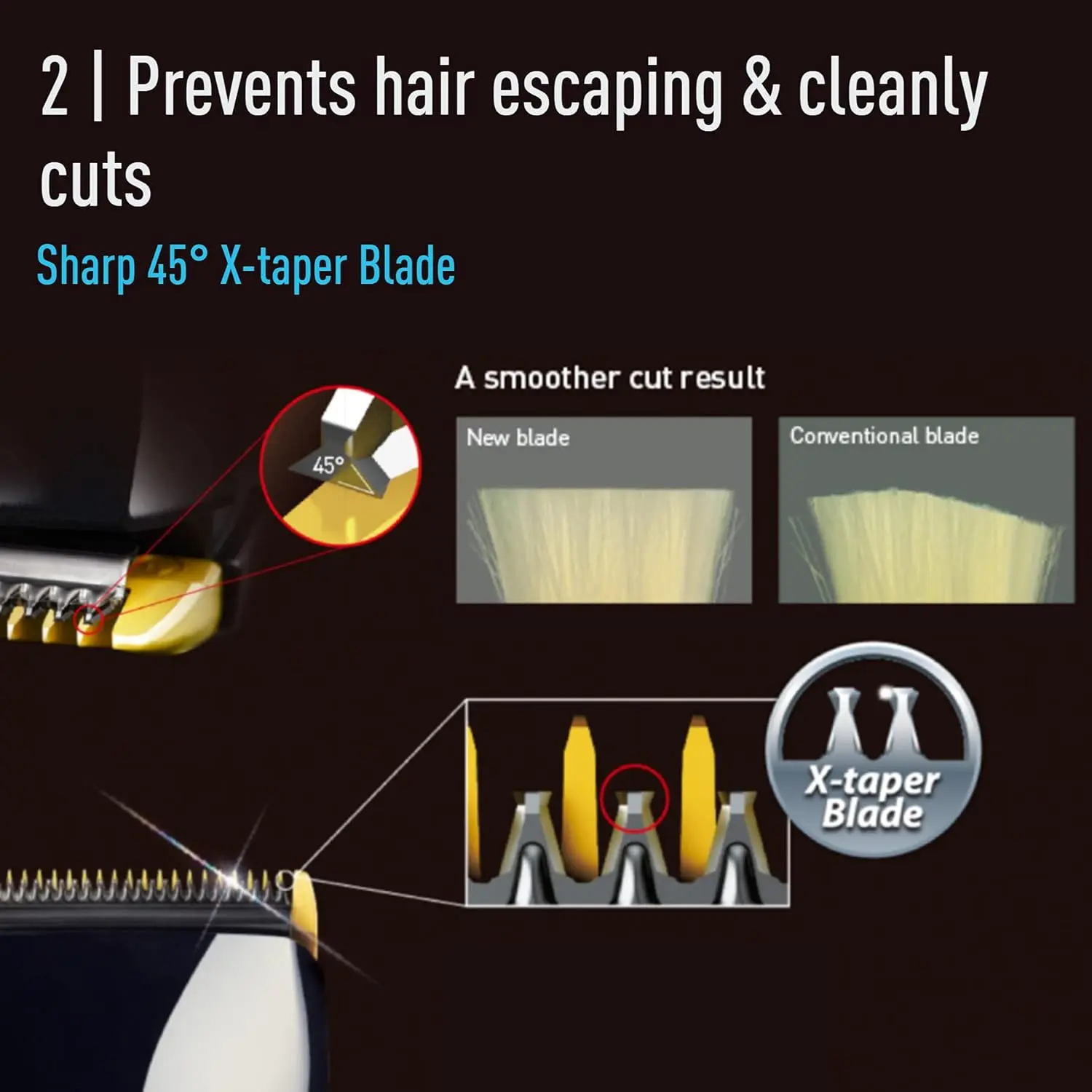 • Uniquely shaped X-taper clipping blades for outstanding cutting performance.
