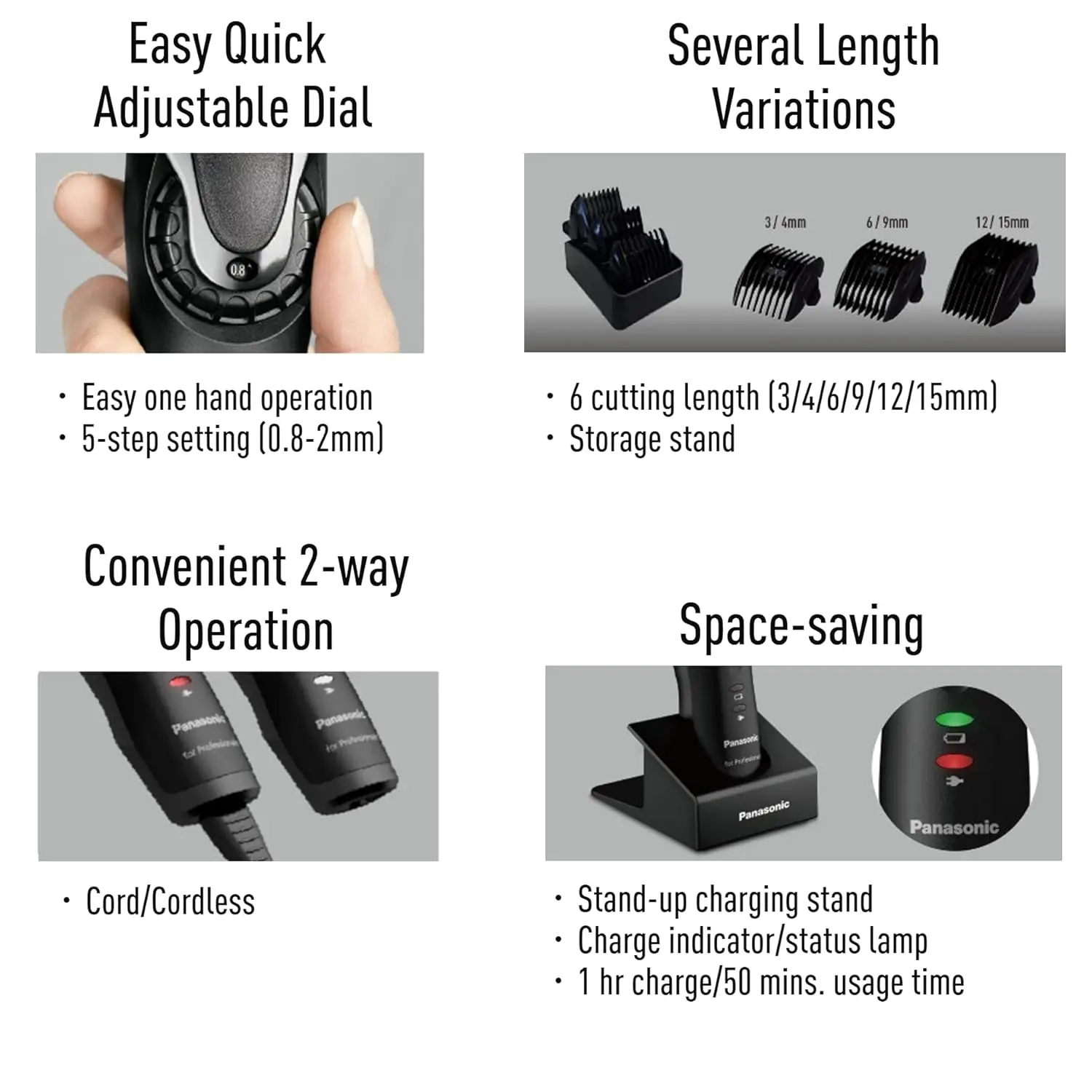 Achieve professional-quality haircuts from the comfort of your own home with the Panasonic ER-GP80 Professional Hair Clipper. This cordless clipper features uniquely shaped X-taper blades with a precise 45° edge, delivering exceptional cutting performance on all hair types. Its powerful and fast linear motor ensures a precise and smooth cut every time. Advanced sensor technology detects hair density and automatically adjusts blade movement speed, maintaining a steady and consistent cutting performance for a flawless finish. The quick-adjustable dial allows for easy length setting, enabling you to adjust the cutting length from 0.8 to 2.0 cm in 0.3 mm steps. Three comb attachments are included, providing versatility for cutting hair to six different lengths (3 to 15 mm). For convenient storage, a special stand is included to neatly organize the attachments. The clipper requires only 1 hour of charge time for 50 minutes of usage, making it perfect for both quick trims and full haircuts. This professional-grade clipper provides the performance and features you need for achieving salon-quality results at home.