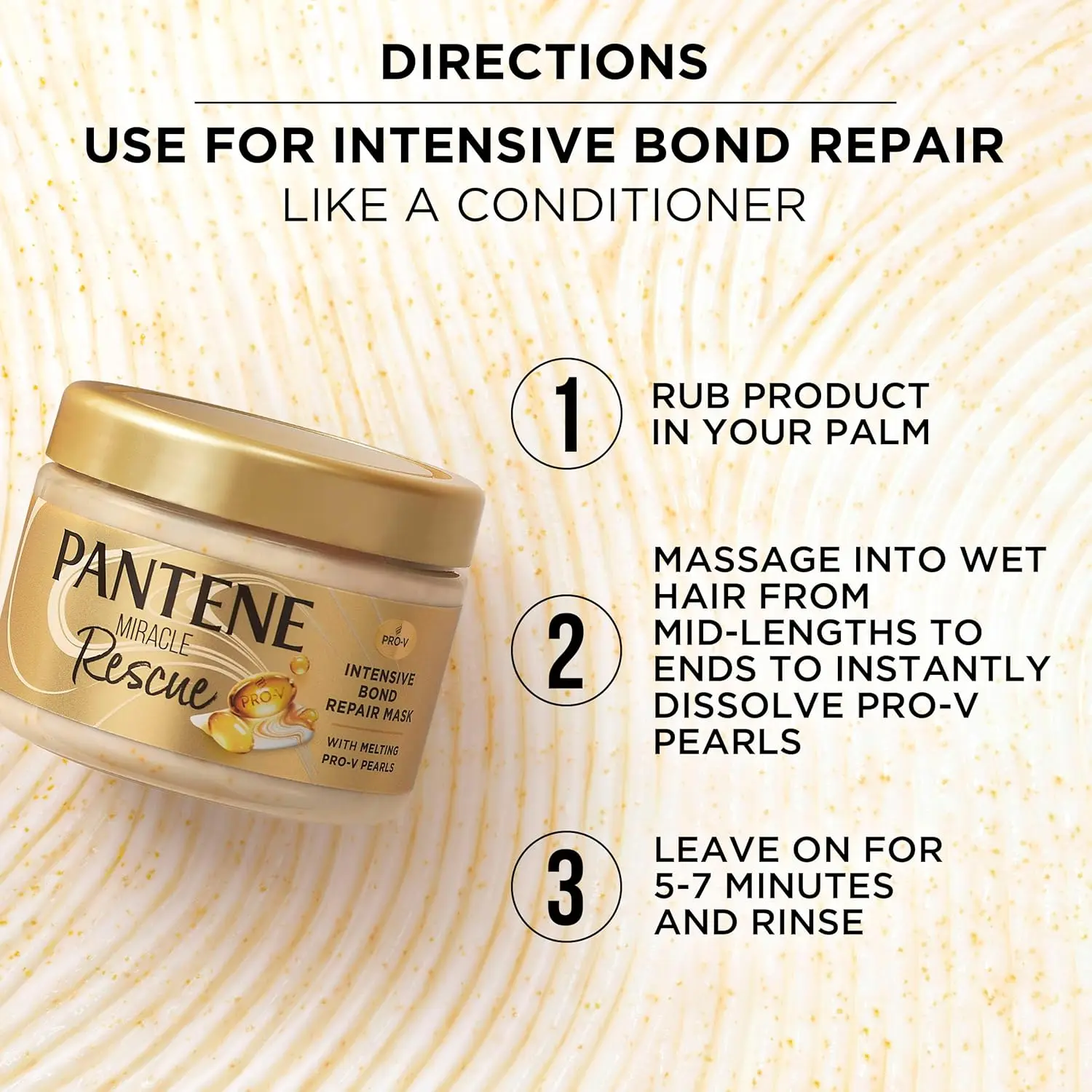 Experience the power of bond repair with Pantene Miracle Rescue Mask. Melting Pro-V Pearls dissolve to nourish hair, strengthening it against breakage. Use daily for stronger locks.