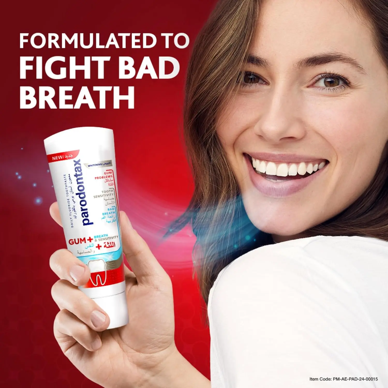 Parodontax Gum, Breath & Sensitivity Toothpaste combats gum problems by targeting bacteria buildup along the gum line, strengthening teeth with fluoride, and providing sensitivity relief for a healthier mouth.