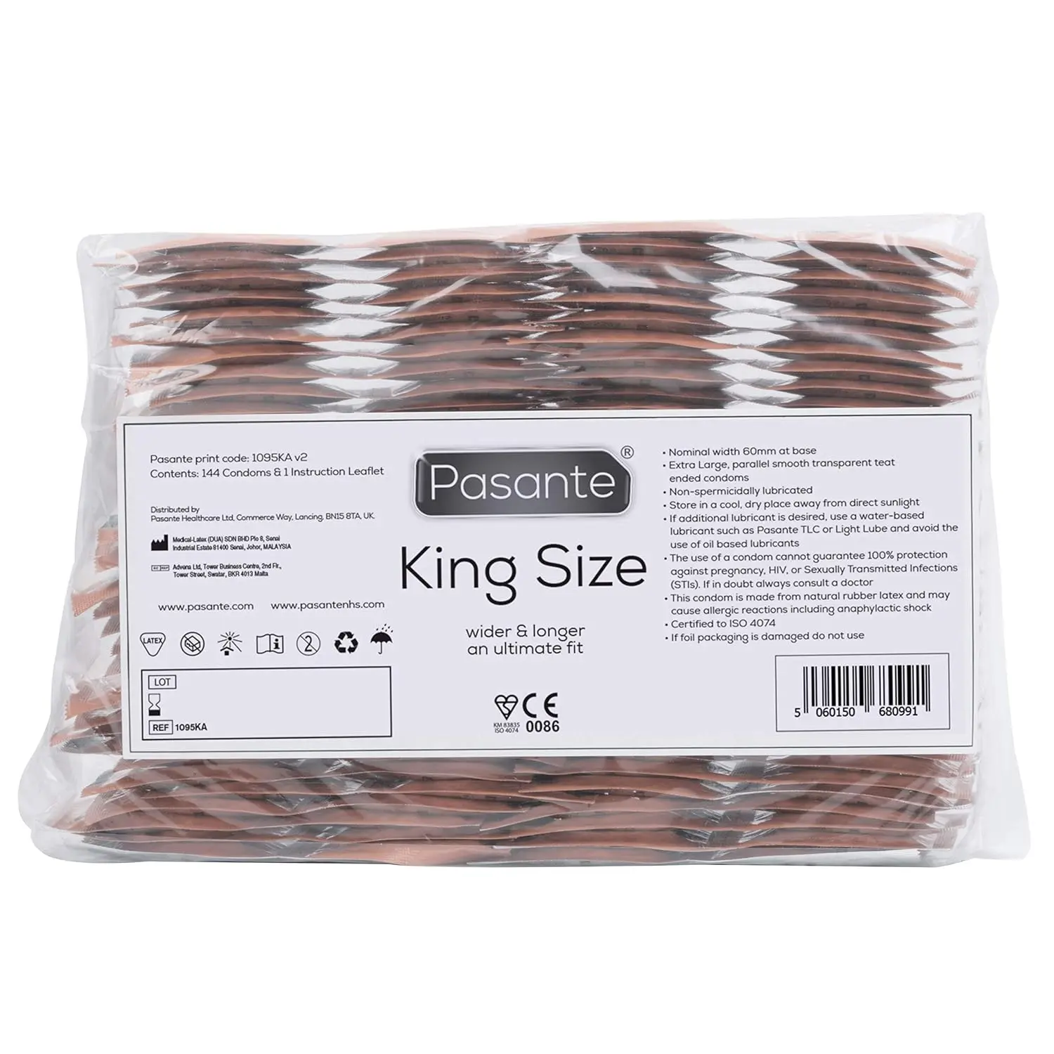 Experience enhanced comfort and confidence with Pasante King Size Condoms. This bulk pack of 144 condoms ensures you’re always prepared for safe and pleasurable encounters. Designed with a wider fit, these condoms offer a more comfortable and secure experience compared to standard sizes. The easy-on fit ensures smooth and hassle-free application, contributing to a more spontaneous and enjoyable experience. Choose from a wide variety of Pasante condoms including Trim, Super King, Extra, Smiley, Ribbed, Regular, Pride, Naturelle, Love, King Size, Ribs & Dots, and Sensitive options, you can find the perfect fit and sensation to suit your preferences. Made from high-quality natural rubber latex, Pasante condoms are both clinically proven and 100% electronically tested, guaranteeing reliability and protection. They carry both the kitemark and CE mark, signifying adherence to the highest quality standards. The transparent and lubricated design provides a natural feeling, enhancing sensitivity and pleasure for both partners. Rest assured that your privacy is a priority; all condoms are shipped in discreet packaging. Whether you’re looking for enhanced comfort, a variety of sensations, or simply reliable protection, Pasante condoms offer the quality and peace of mind you deserve.