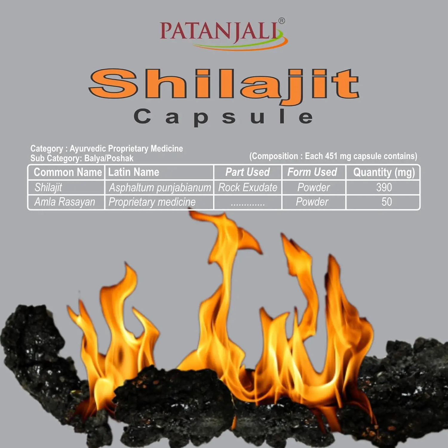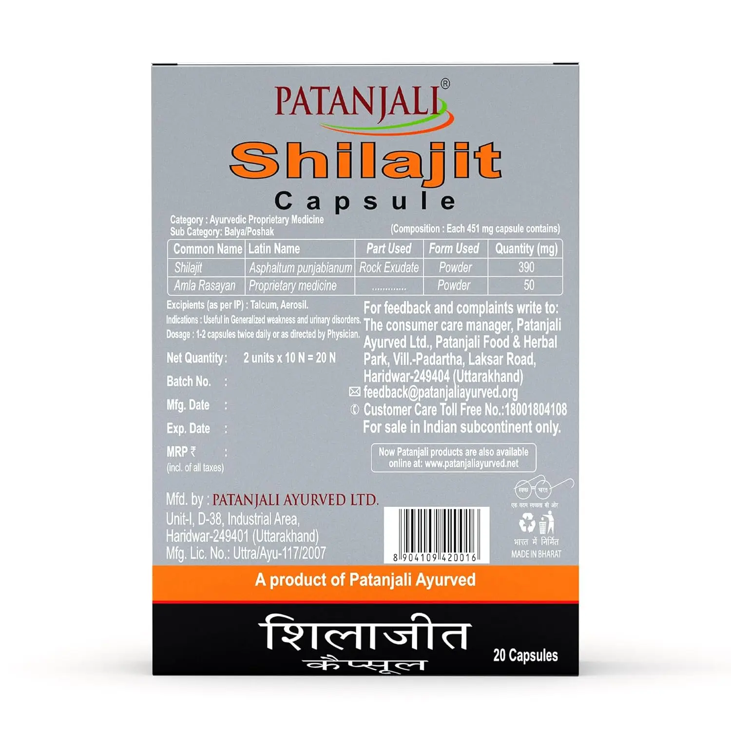 Patanjali Shilajit Capsules, an Ayurvedic supplement, revitalizes strength and stamina. Contains processed Shilajit, a general tonic and rejuvenator for weakness.