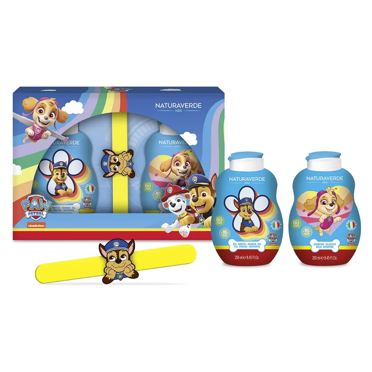 Transform your child’s daily hygiene routine into an exciting adventure with this Paw Patrol Gift Set! Featuring their favorite characters, bath time will become a fun and engaging experience. This set includes a gentle shower gel and shampoo, both specially formulated for kids’ delicate skin and hair. Plus, a fun Paw Patrol slap bracelet adds an extra touch of playful excitement. The shower gel and shampoo, each 250ml, are dermatologically tested and boast a fragrance free from allergens, ensuring a safe and enjoyable experience for your little one. Naturaverde Kids Paw Patrol products are designed to accompany the brave emergency dog team in every moment of your kid’s day. Let Naturaverde Kids bring play and fun to any time of day and transforms children’s daily hygiene routine into magical moments of growth: every moment of daily life, even in the bathroom and hygiene, with Naturaverde Kids become emotional. Make bath time something to look forward to! This gift set is the perfect way to make daily hygiene fun and memorable. Perfect for birthdays, holidays, or just because, the Paw Patrol Gift Set is sure to bring a smile to your child’s face.