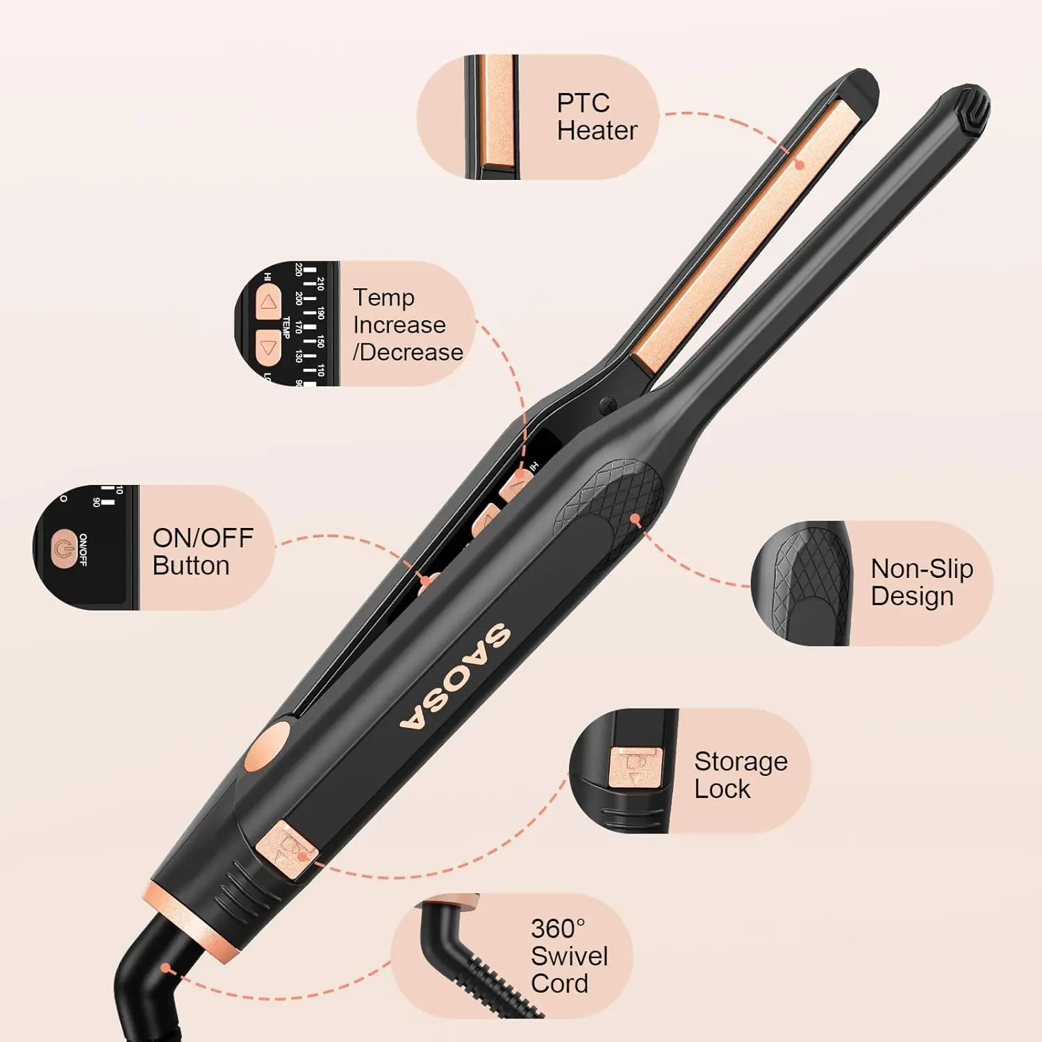 Achieve salon-quality styling for short hair, pixie cuts, and bangs with our versatile pencil flat iron. Featuring 3/10 inch thin floating plates, this straightener provides exceptional precision, allowing you to reach roots and edges with ease for effective styling. No need for multiple hair tools – this one does it all! The smart PTC heater ensures rapid 30-second heat-up and consistent heat distribution, making it perfect for quick styling. With a wide temperature range from 190℉ to 430℉, you can customize the heat to suit your specific hair type, protecting your hair’s health. Travel-friendly with 100-240V universal voltage, it automatically adjusts to the correct voltage for worldwide use. Includes essential accessories like a glove and heat-proof travel pouch for convenient storage. Safety is paramount with the 60-minute auto shut-off function. The 6.5ft extra-long 360° swivel cord offers tangle-free and convenient styling.