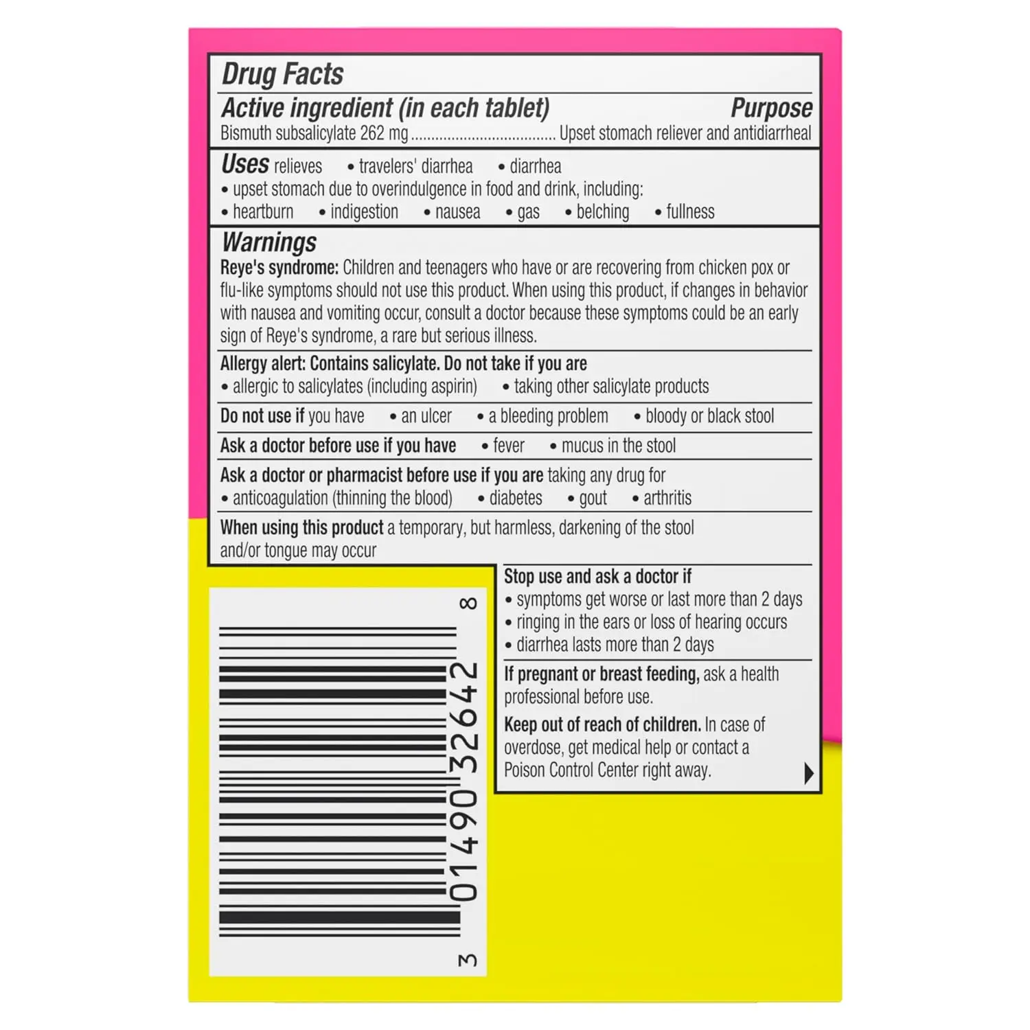 Experience comprehensive stomach relief with Pepto Bismol Chewables! These chewable tablets provide fast and effective relief from five common stomach symptoms: nausea, heartburn, indigestion, upset stomach, and diarrhea. Pepto Bismol’s unique coating action works to calm your stomach and soothe your digestive system, providing relief that’s just as effective as liquid Pepto Bismol. The convenient chewable form makes it easy to take on-the-go, whether you’re traveling, at work, or simply out and about. Say goodbye to the discomfort of stomach upset and hello to fast, reliable relief with Pepto Bismol Chewables. As the #1 pharmacist-recommended brand for upset stomachs, you can trust Pepto Bismol to deliver the quality and effectiveness you need. Made by P&G, Pepto Bismol adheres to high quality standards, ensuring you receive a reliable product you can depend on. Keep Pepto Bismol Chewables on hand for fast, convenient relief whenever stomach troubles strike. Get back to feeling your best with the trusted power of Pepto Bismol. Don’t let stomach issues slow you down – choose Pepto Bismol Chewables for fast, effective, and on-the-go relief.