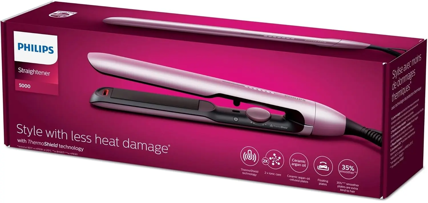 Achieve salon-worthy results with the Philips 5000 Hair Straightener ThermoShield in Mauve. This innovative straightener is designed to minimize heat damage while delivering sleek, smooth, and shiny hair. Featuring ThermoShield technology, the built-in heat sensor intelligently regulates the temperature, ensuring consistent and even smoothing across every strand. Say goodbye to uneven results and hello to beautifully straightened hair with less risk of damage. The advanced springy ceramic plates glide effortlessly through your hair, providing 50% faster straightening compared to standard straighteners. These plates are also designed to adjust the pressure to your hair, ensuring even heat distribution and enhanced smoothness. Experience hair that is 35% smoother thanks to Philips’ advanced plate technology. Enhance the natural shine of your hair with the double ionisation function. This technology releases millions of negative ions per styling session, neutralizing static and frizz, leaving your hair smooth, nourished, and radiating with a healthy glow. This set includes the Philips 5000 series wired straightener in a stylish mauve color and a convenient heat-resistant roll-up bag for safe storage and portability. Get ready to experience the perfect combination of performance, protection, and convenience with the Philips 5000 Hair Straightener ThermoShield.