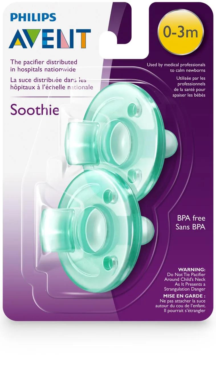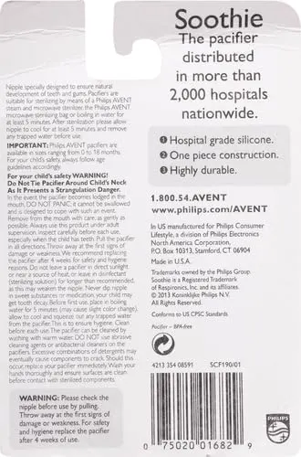 Soothe your newborn with the Philips Avent Soothie Pacifier, trusted by hospitals nationwide. This pacifier is specifically designed for newborns aged 0-3 months and is made from hospital-grade silicone, ensuring the highest standards of safety and hygiene for your little one. The one-piece construction enhances durability and prevents the accumulation of dirt and bacteria, making it easy to clean and maintain. Its unique shape and size are carefully crafted to fit comfortably in your baby’s mouth, promoting natural sucking action and soothing their delicate gums. The Soothie Pacifier is also BPA and latex-free, providing parents with peace of mind knowing that their baby is using a safe and reliable product. It is used by medical professionals to calm newborns. Packaging may vary. The Philips Avent Soothie pacifier is designed for comfort and safety for the little one.