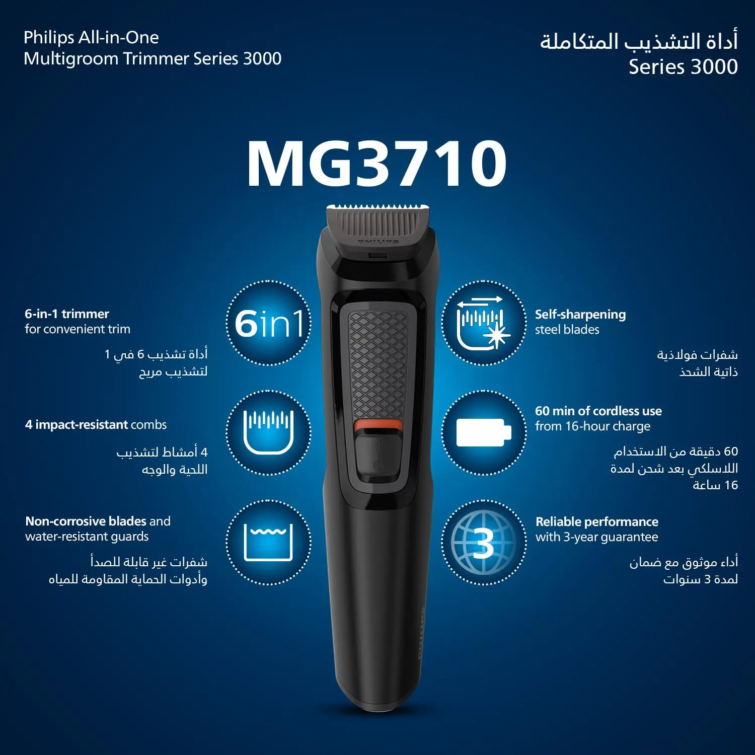 Achieve your desired look with the Philips Multigroomer 6-in-1. This versatile grooming kit provides everything you need for precise styling of your face. Enjoy up to 60 minutes of cordless use on a single charge, giving you the freedom to groom anywhere. The included four combs offer various trimming lengths, allowing you to customize your style with ease. Maintaining the Multigroomer is simple, thanks to its rinseable attachments. Its easy to maintain and clean. The powerful Ni-Mh battery ensures long-lasting performance, and the 16-hour full charge time prepares you for weeks of grooming sessions. This all-in-one solution is perfect for maintaining a neat and polished appearance, offering convenience and flexibility for all your grooming needs. This is the ultimate grooming kit for any modern man.