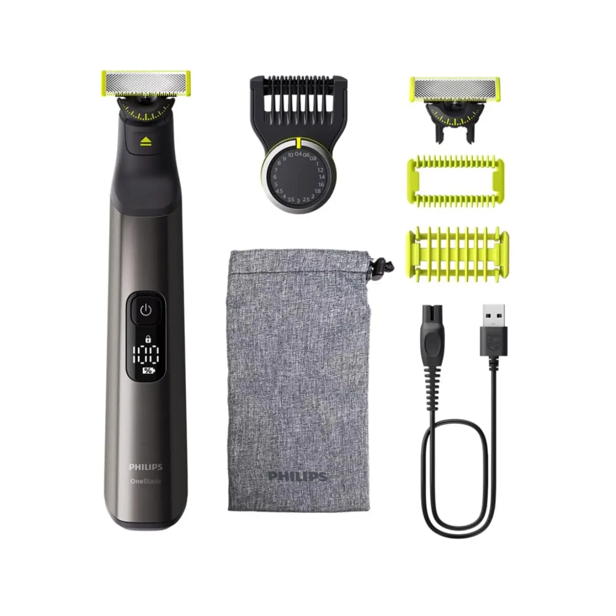 Experience the revolutionary Philips OneBlade Pro 360 Face & Body Trimmer, a game-changer in grooming technology. This versatile tool is designed to trim, shave, and create clean edges on any length of hair, providing a comfortable and efficient grooming experience. The OneBlade’s fast-moving cutter (12,000xmin) effortlessly tackles even longer hairs, while the dual Protection System, featuring a glide coating and rounded tips, ensures a smooth and irritation-free shave. The innovative 360 blade flexes in all directions, maintaining constant skin contact for superior control and precision, even in hard-to-reach areas. Achieve your desired look with fewer passes and greater comfort. Designed to cut hair, not skin, the OneBlade Pro 360 offers exceptional performance and safety. Use the included 20-length precision comb (0.4-10mm) to trim your beard to an even stubble length. Create precise edges with the dual-sided blade, and effortlessly shave off any unwanted hair. The OneBlade Pro 360 is 100% waterproof, making it easy to clean – simply rinse it under the tap. Shave wet or dry, with or without foam, according to your preference. The durable stainless steel blade lasts up to 4 months, ensuring long-lasting performance. An eject icon will appear on the blade when it’s time for a replacement. This comprehensive set includes the Philips OneBlade Pro 360 Face & Body, two 360 blades, a 20-length precision comb (0.4-10mm), a Body Kit (including a click-on body comb and skin guard), and a protection cap.