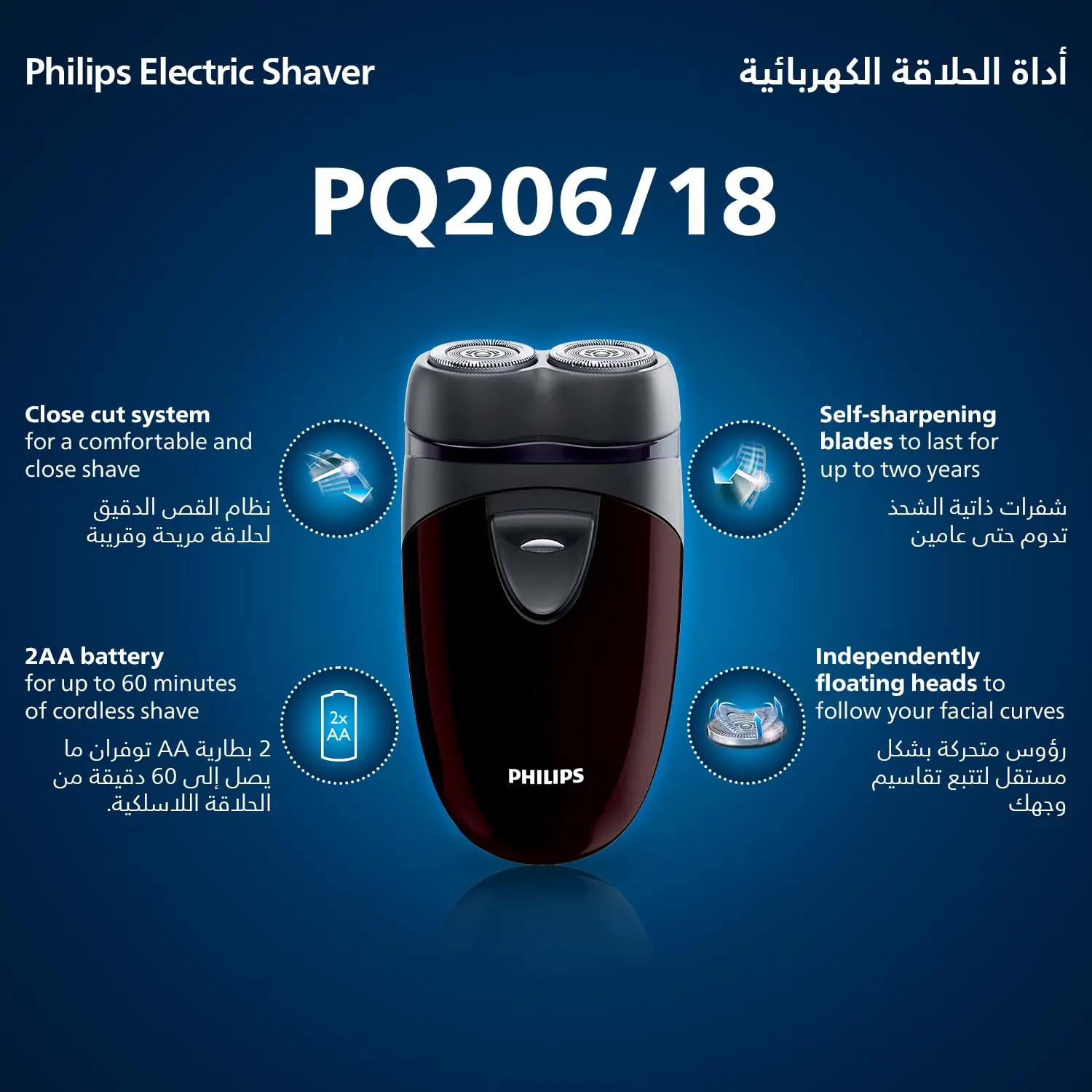 Experience a consistently smooth and comfortable shave with the Philips PQ206/18 Electric Shaver. This battery-powered shaver offers the convenience of cordless operation, allowing you to groom anywhere, anytime. The independently floating heads effortlessly adjust to the contours of your face, ensuring close skin contact and capturing every hair for a clean and even shave. Forget about constantly replacing blades; the self-sharpening blades are designed for long-lasting performance, providing up to two years of reliable shaving. Powered by 2AA batteries, this shaver delivers up to 60 minutes of cordless shaving time, perfect for travel or quick touch-ups. Its compact and lightweight design makes it easy to handle and store, while its durable construction ensures it can withstand daily use. Upgrade your grooming routine with the Philips PQ206/18 Electric Shaver and enjoy a hassle-free shaving experience with lasting results. Achieve a consistently close shave with the Philips PQ206/18. Experience the freedom of cordless shaving with up to 60 minutes of runtime. The self-sharpening blades offer long-lasting performance for years. The shaver’s floating heads adjust to your face for a comfortable shave. The Philips PQ206/18 provides a reliable and convenient solution. Perfect for men who value efficiency and quality in their grooming routine. Invest in a shaver that combines advanced technology. Designed for daily use and provides a close, comfortable shave every time. Easy to use and maintain, this shaver is an excellent choice.