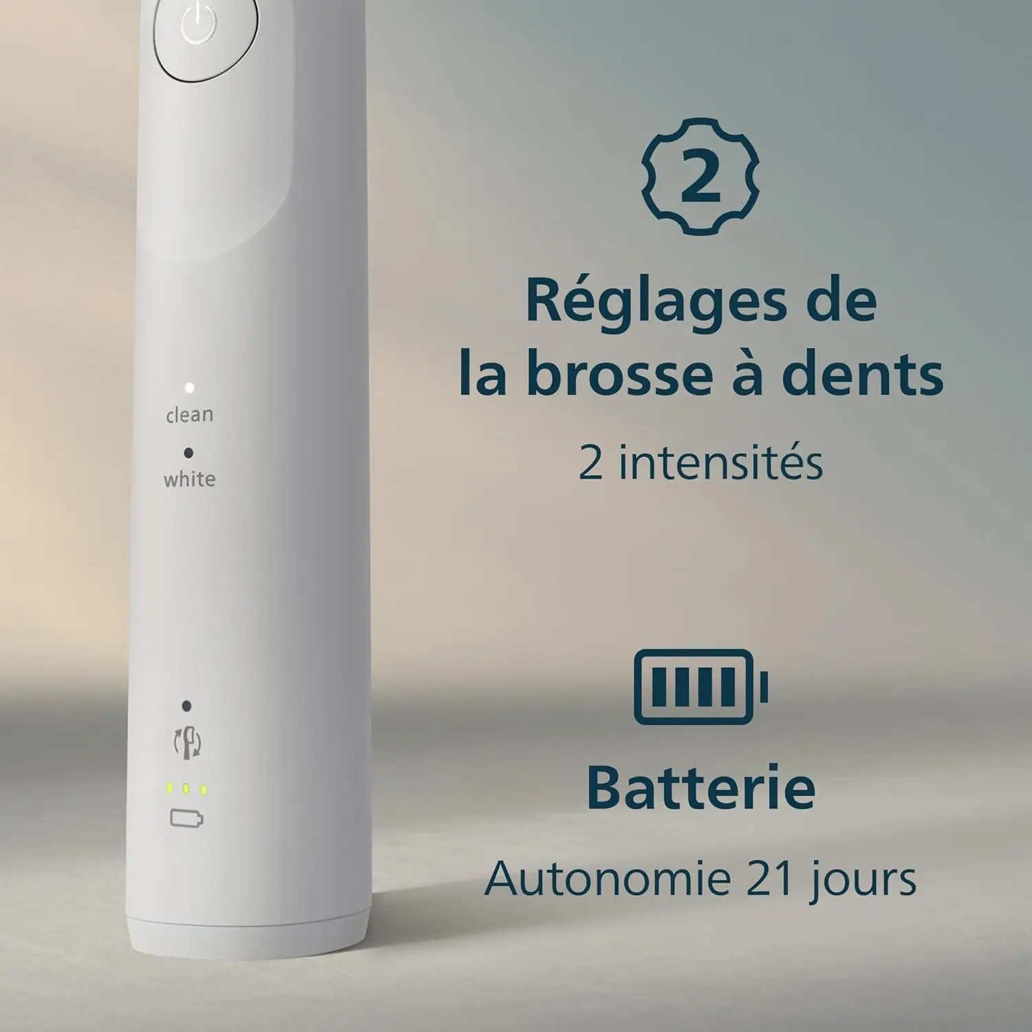 The Sonicare 5500 offers personalized cleaning with two distinct modes to suit your specific needs. The Clean mode is designed for excellent plaque removal, ensuring a thorough and effective everyday clean. Switch to White mode to target and remove superficial discoloration, revealing a radiant and confident smile.