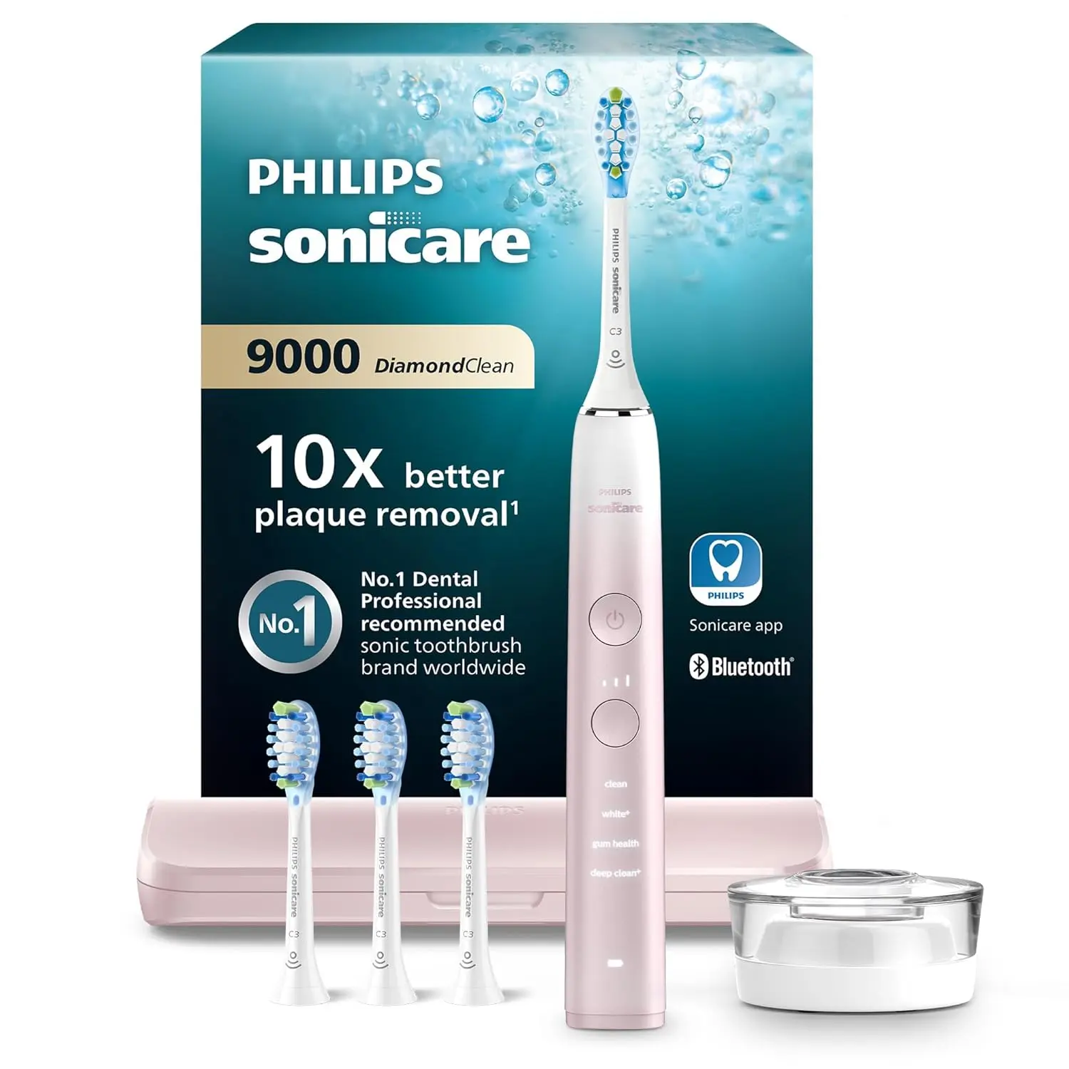 Achieve an effortlessly white smile in just 3 days with the Philips Sonicare DiamondClean 9000 series! This advanced electric toothbrush removes surface stains effectively while promoting exceptional cleaning and gum health. The premium plaque control brush heads work diligently to clean and whiten your teeth, leaving you with a brighter, healthier smile. Choose from four distinct brushing modes – Clean, Deep Clean+, Gum Health, and White+ – to tailor your cleaning experience to your specific needs. Enhance your brushing routine with the Sonicare app, which guides you to use the optimal mode and intensity for maximum plaque removal. Experience the power of advanced Sonicare technology, delivering 31,000 pulses per minute to drive plaque-fighting bubbles between your teeth and gums for a gentle yet thorough cleanse. The Special Edition includes the Philips Sonicare DiamondClean 9000 Series Electric Toothbrush in a stylish Pink finish, along with four C3 Premium Plaque Defense Brush Heads, a convenient Travel Case, and a Charging Station with Puck. Unlock a superior clean and a radiant smile with the Philips Sonicare DiamondClean 9000.