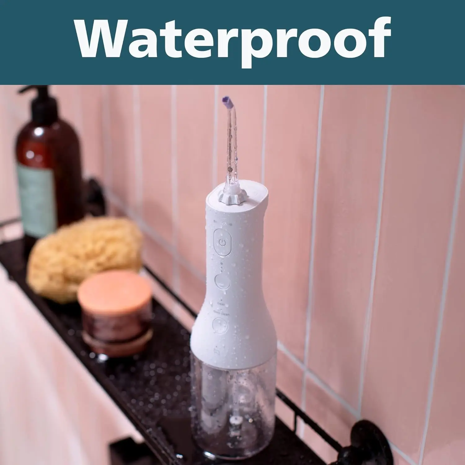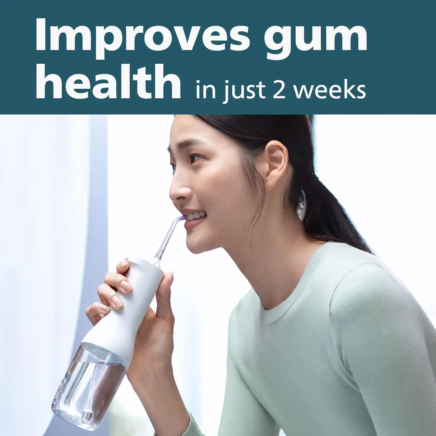 Experience a superior clean with the Philips Sonicare Power Flosser 3000 Cordless in White. This innovative power flosser is up to 150% more effective than traditional floss, promoting healthier gums and a brighter smile. Its unique Quad Stream technology creates four wide streams of water that gently and effectively clean between teeth and along the gumline, removing plaque and debris where brushing can’t reach. The cordless design and waterproof construction offer ultimate convenience, allowing you to floss anytime, anywhere. Enjoy a long-lasting 14-day battery life on a single charge. Philips Sonicare’s Pulse Wave Technology gently pulses water to guide you from tooth to tooth, ensuring no spot is missed. The whisper-quiet design ensures a discreet and comfortable cleaning experience, allowing you to achieve great results without disturbing others. This comprehensive set includes the Cordless Power Flosser, two nozzles (Quad Stream and Standard), a USB-C charging cable, and a wall adapter. Upgrade your oral hygiene routine today and discover the difference the Philips Sonicare Power Flosser 3000 can make. Get a deeper, more effective clean with the Philips Sonicare Power Flosser 3000. This cordless water flosser uses Quad Stream technology to reach between teeth and along the gum line for a more thorough clean. It is up to 150% more effective than floss, promoting healthier gums. It’s also waterproof and cordless, offering 14 days of battery life.
