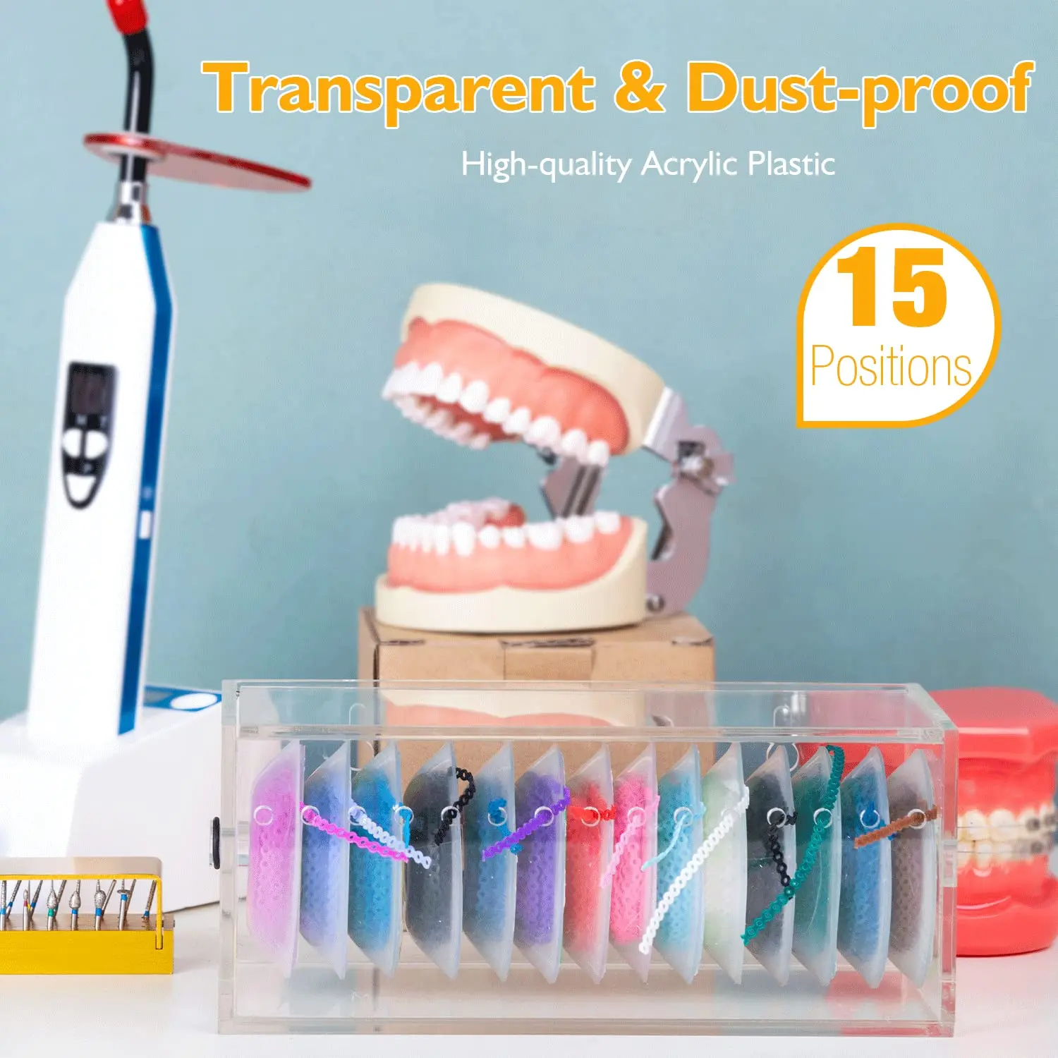 High-quality acrylic power chain organizer with 15 positions. Transparent cover keeps orthodontic bands visible and dust-free. Improves efficiency & prevents loss.