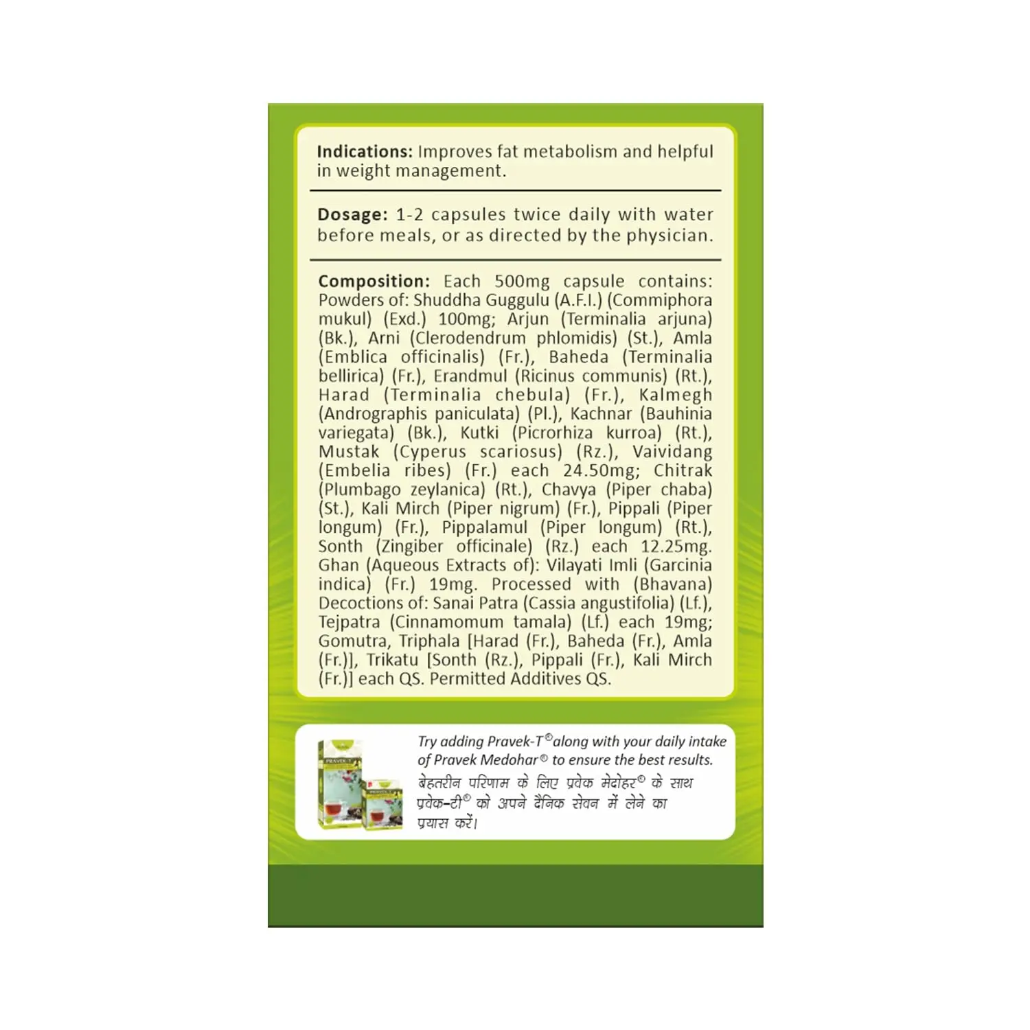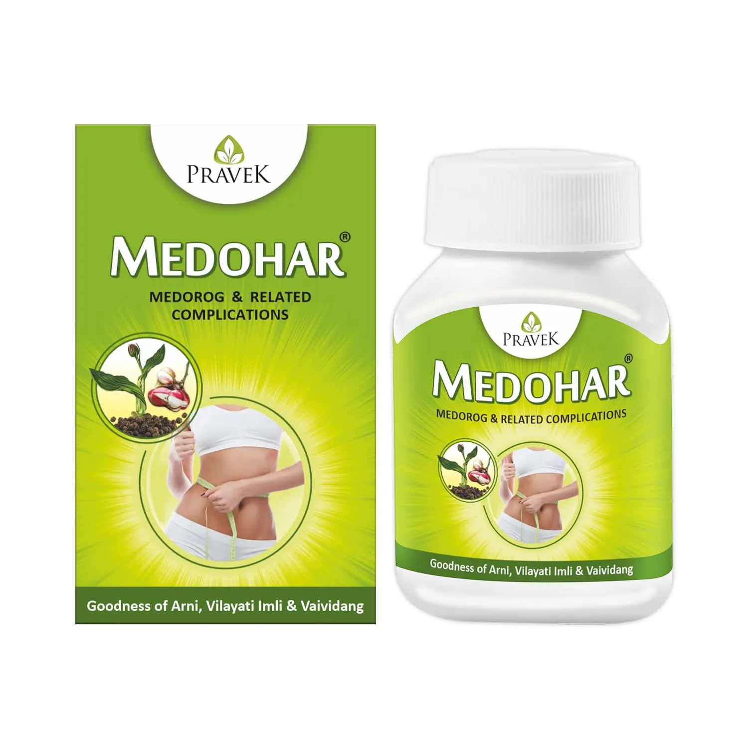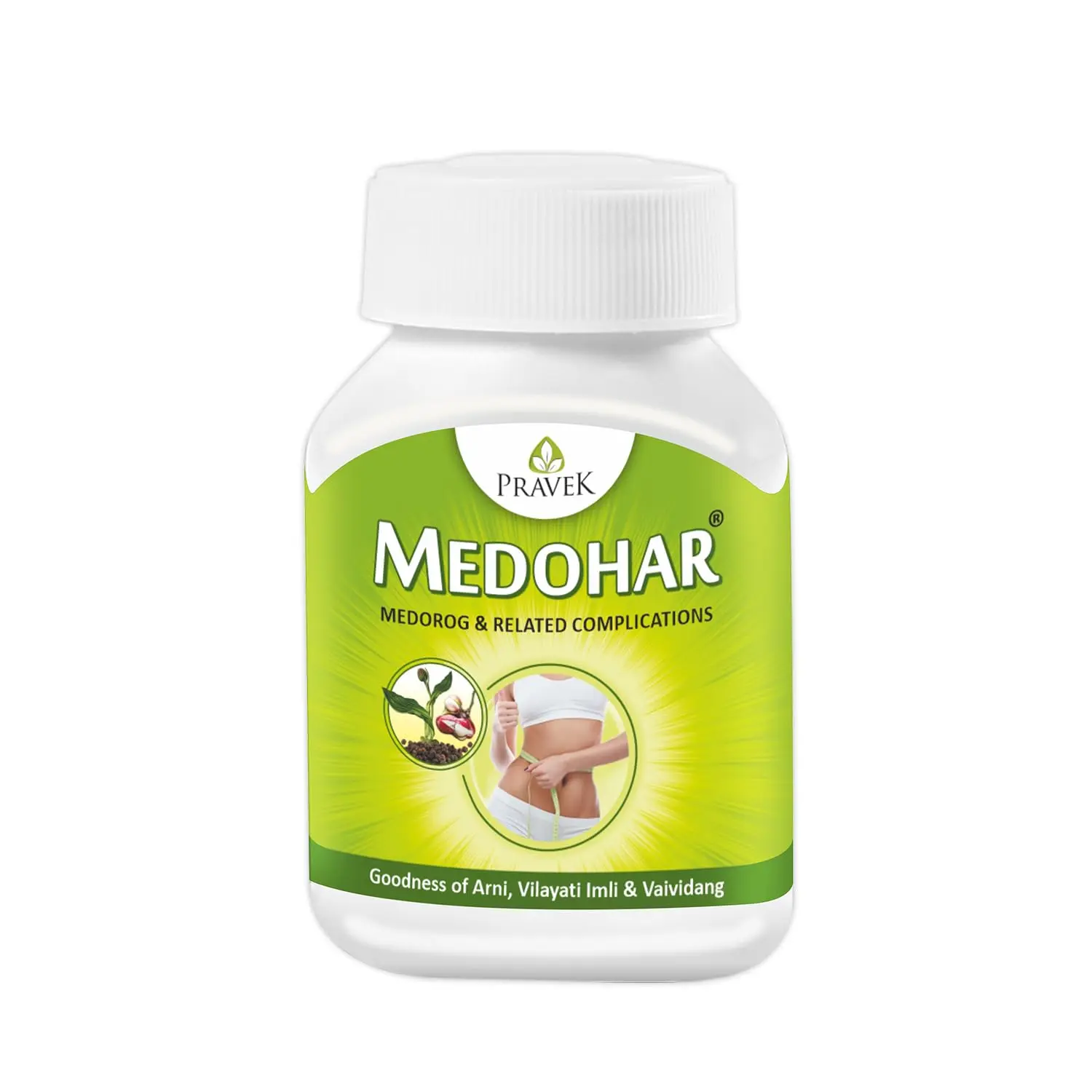 Pravek Medohar is an Ayurvedic formulation designed to aid in the treatment of Medorog (a condition characterized by excessive fat accumulation) and support healthy weight management. This carefully crafted blend of traditional herbs works synergistically to promote fat metabolism, reduce unhealthy cravings, and improve overall well-being. Medohar harnesses the power of nature’s bounty, combining potent ingredients like Indian Bdellium, Villayati Imli, Mustak, Arni, Black Pepper, and Babreng, each known for their unique therapeutic properties. Indian Bdellium is traditionally used for its lipid-lowering and anti-inflammatory effects. Villayati Imli helps to control appetite and support healthy digestion. Mustak aids in detoxification and promotes healthy metabolism. Arni is known for its diuretic and fat-burning properties. Black Pepper enhances the bioavailability of other herbs and aids in digestion. Babreng helps to eliminate toxins and support healthy weight management. For optimal results, incorporate Pravek-T into your daily routine alongside Pravek Medohar. This synergistic combination provides a comprehensive approach to weight management, supporting your journey towards a healthier and more vibrant you. Made in India in a GMP & ISO certified facility, Pravek Medohar adheres to the highest quality standards, ensuring purity, potency, and safety. As an Ayurvedic preparation, it is generally well-tolerated, with no side effects reported to date. However, it is always recommended to consult with a healthcare professional before starting any new supplement regimen, especially if you have any underlying health conditions or are taking other medications. Embrace the power of Ayurveda and embark on a transformative journey towards a healthier and more balanced lifestyle with Pravek Medohar. Follow the recommended dosage of 1-2 capsules twice daily with water before meals, or as directed by your physician, to experience the full benefits of this ancient wisdom.