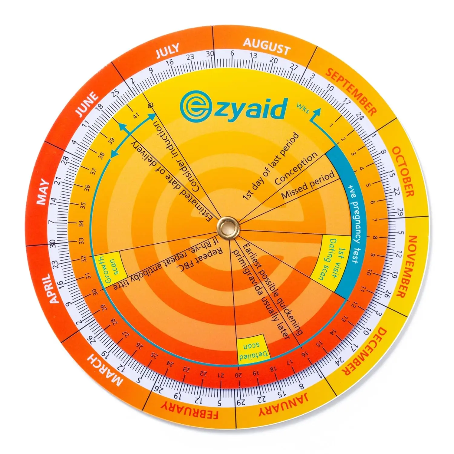 Our wheel goes beyond just predicting your due date. It provides insights into key milestones such as conception, missed period, the recommended timing for your first dating scan, the earliest possible time to feel quickening, and the ideal window for your detailed anatomy scan. Having all this information readily available empowers you to stay informed and proactive throughout your pregnancy journey.