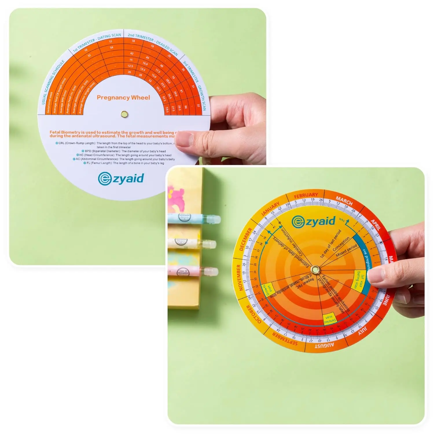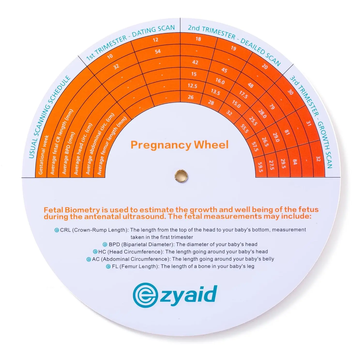 We understand the importance of fetal development monitoring. That’s why the back of our Pregnancy Wheel features comprehensive fetal biometry guides. Easily reference CRL (Crown-Rump Length), BPD (Biparietal Diameter), HC (Head Circumference), AC (Abdominal Circumference), and FL (Femur Length) to track your baby’s growth at each stage. These measurements are essential for assessing fetal health and development, making our wheel an indispensable tool for midwives, nurses, and OB-GYN doctors.