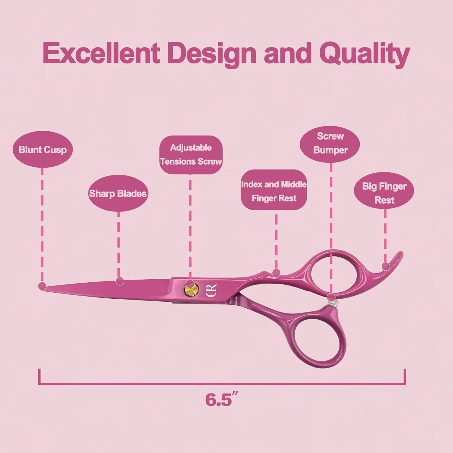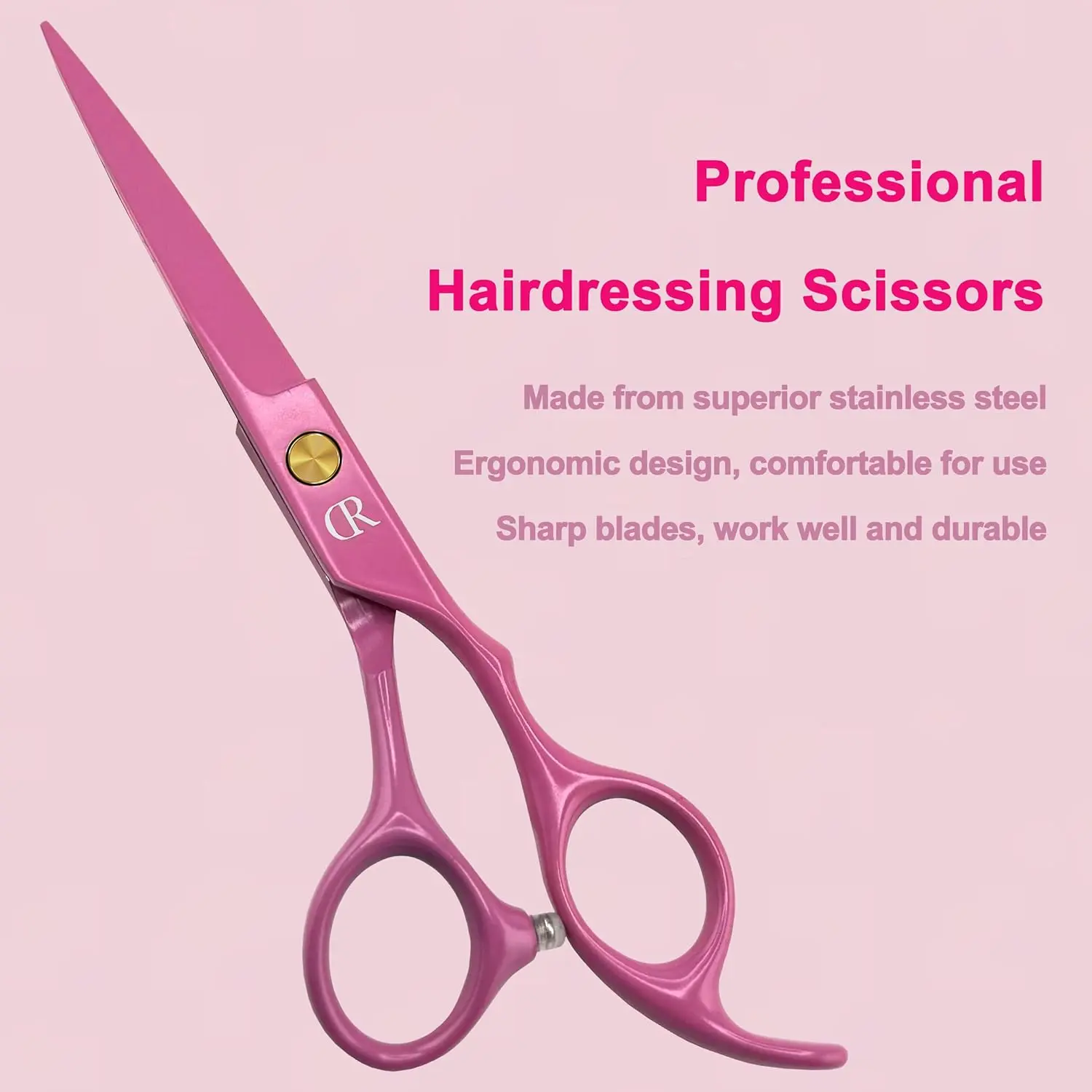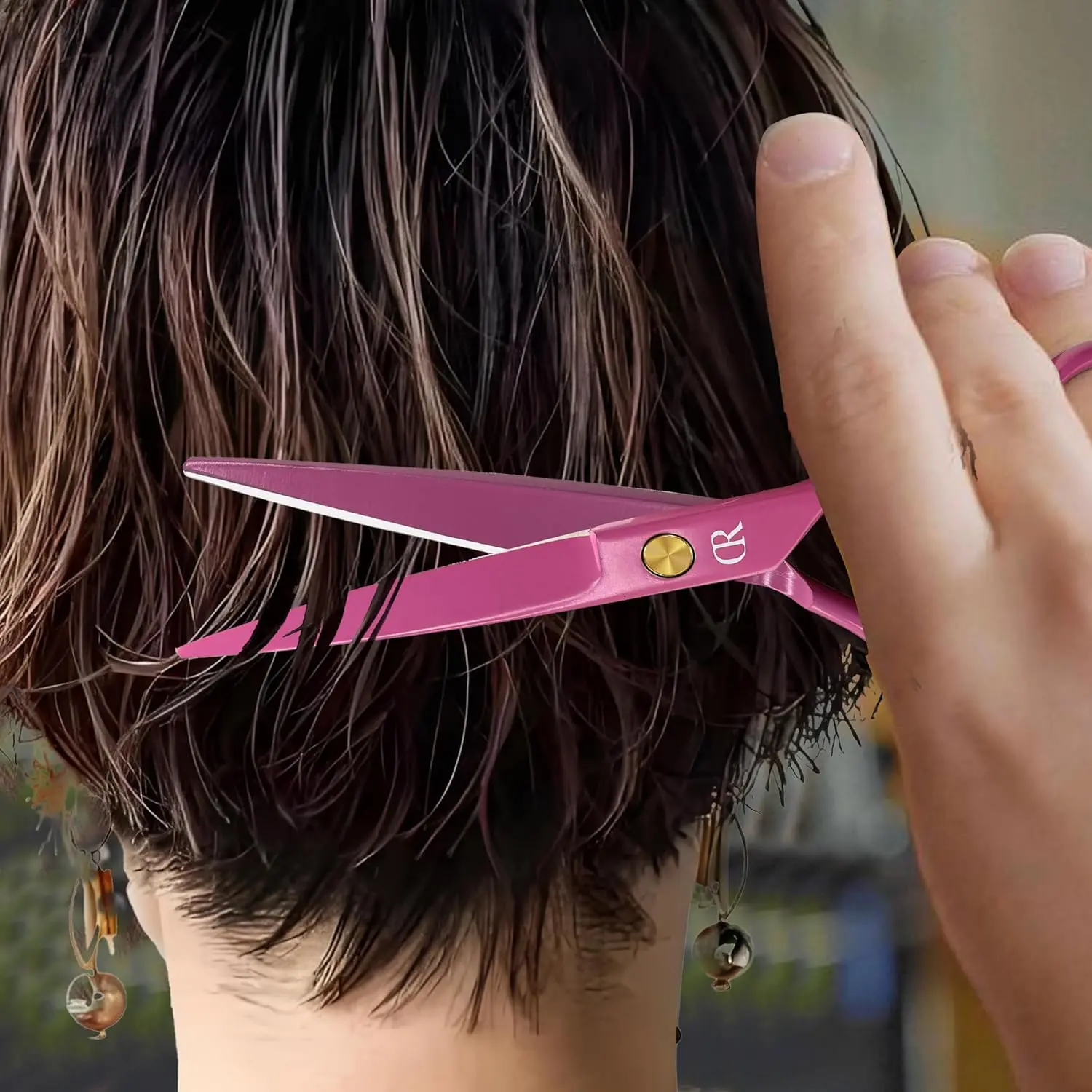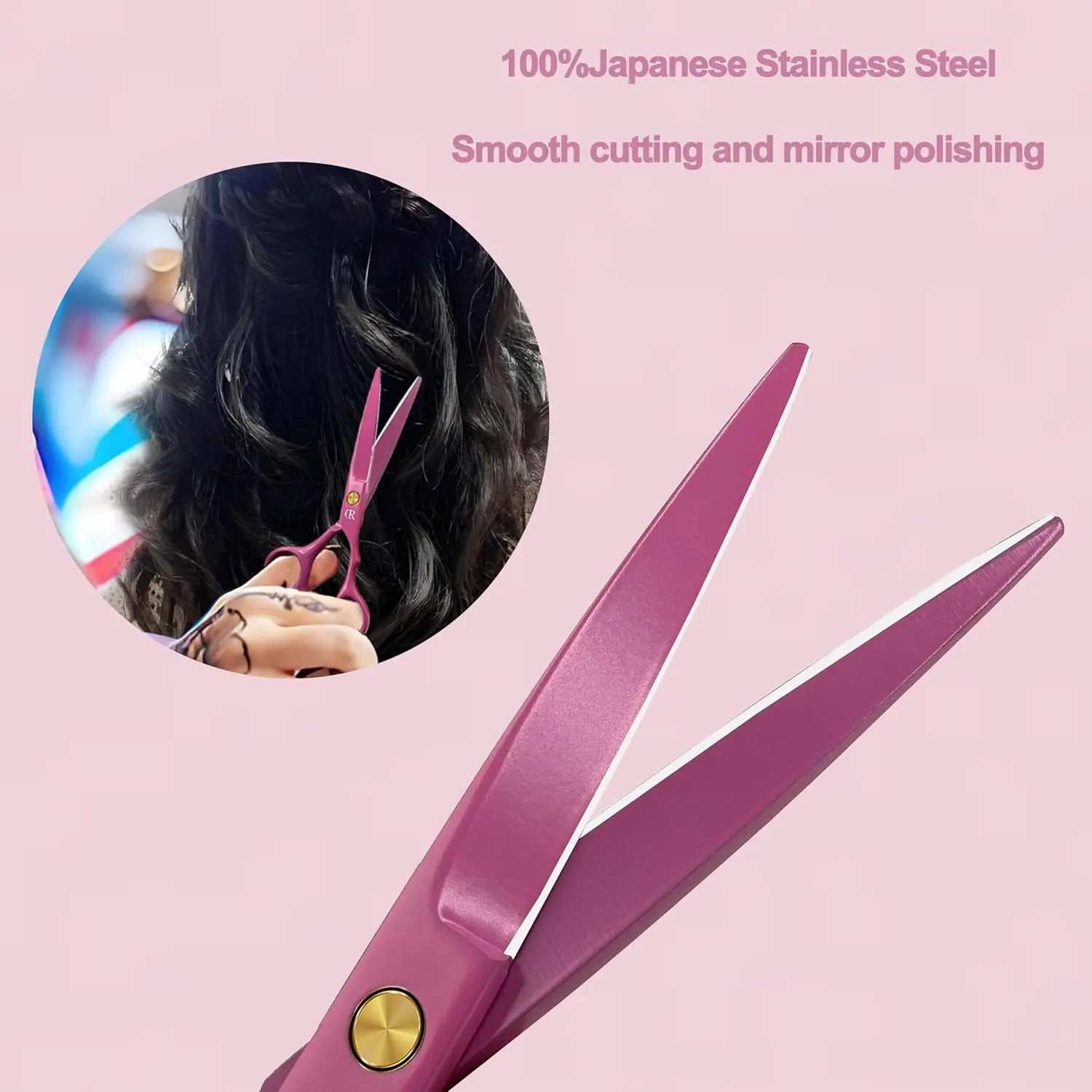 Experience the pinnacle of professional hairdressing with our tailor-made, high-end hair cutting scissors. Crafted with meticulous attention to detail, these pink barber shears are designed for discerning stylists who demand excellence. We use only Japan-imported 440c top steel, ensuring exceptional durability and sharpness. Each pair is 100% handmade, reflecting our commitment to quality and our focus on delivering the best possible tool for every customer. The ergonomic design features a comfortable curved handle that reduces strain during long cutting sessions. This allows each finger to work independently, offering greater freedom and control. The razor-sharp blade effortlessly cuts through hair, whether dry or wet, thanks to the high hardness of the steel. The blade is hand-crafted through multiple processes, resulting in a clearly defined, precision cutting edge. Fine-tuning bearings ensure smooth opening and closing, minimizing friction and enhancing stability. The VG10 top steel regulator adds extra firmness and longevity. We guarantee the quality of our scissors. They are made from Japanese 420c premium steel, hand-polished and forged to achieve a hardness of up to 62HRC. This exceptional hardness provides excellent wear resistance, ensuring that the scissors will perform flawlessly for decades, even under high-intensity use. Our Japanese stainless steel hair cutting scissors are tempered with precise blades and hand-sharpened razor cutting edges. We maintain a strict weight control of only 2.11-2.2 ounces, preventing hand fatigue during extended use. Furthermore, we’ve increased the inner diameter of the finger rings, providing a comfortable, non-restrictive fit. Elevate your craft with scissors designed for precision, comfort, and enduring performance.
