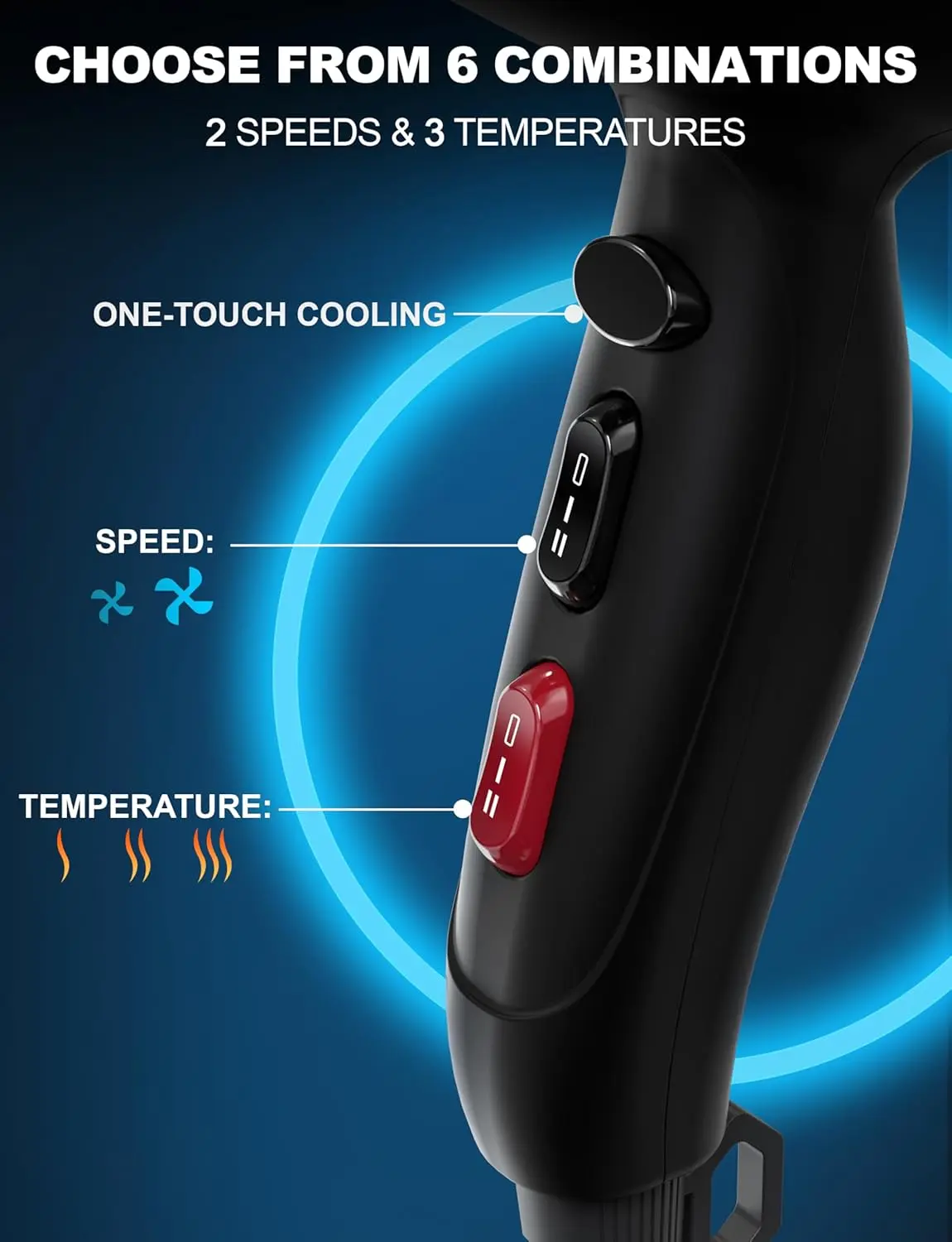 • Multiple Styles: 2 air speeds, 3 temperature settings, and one-touch cold air button.