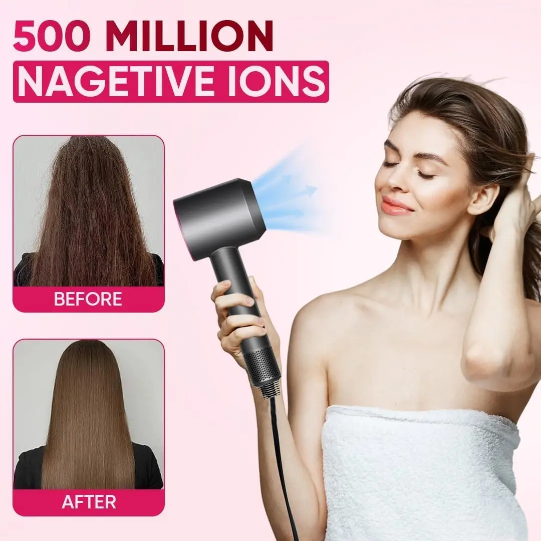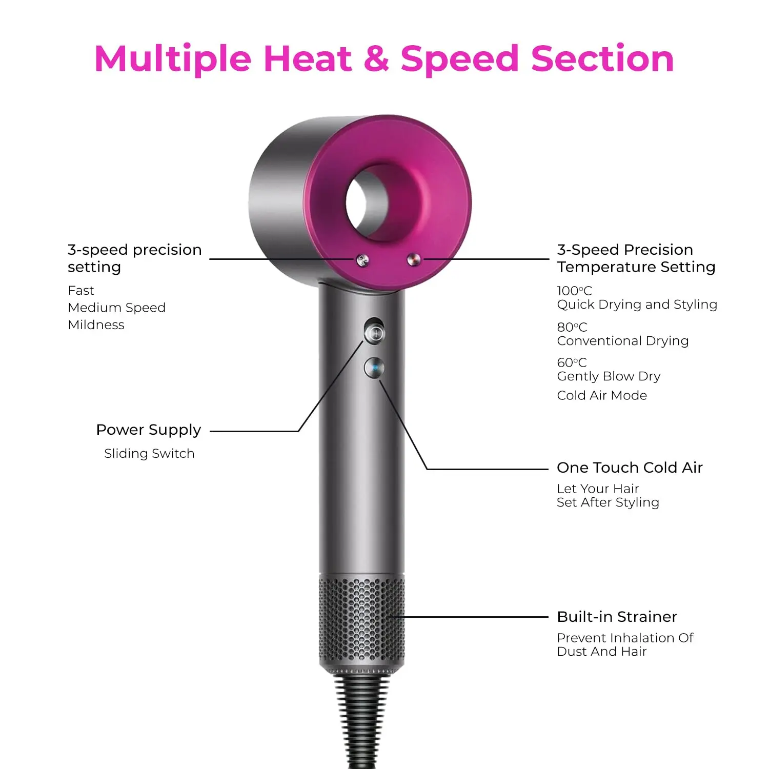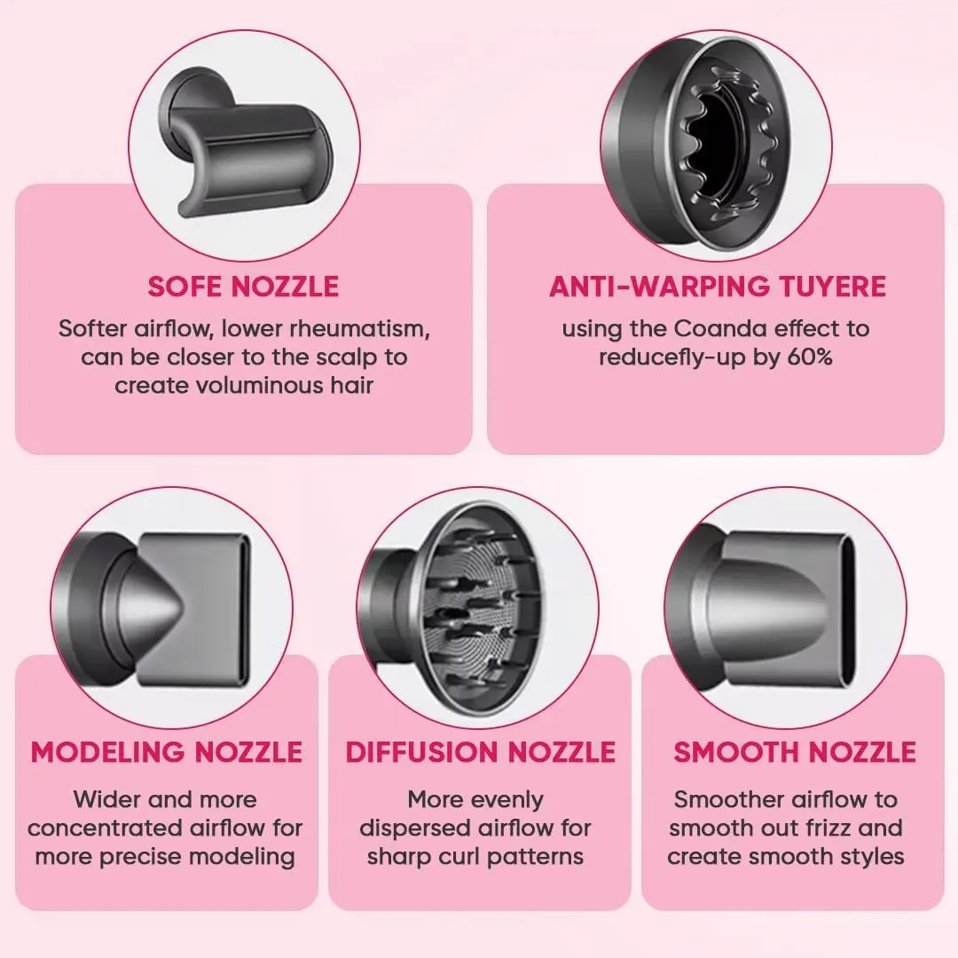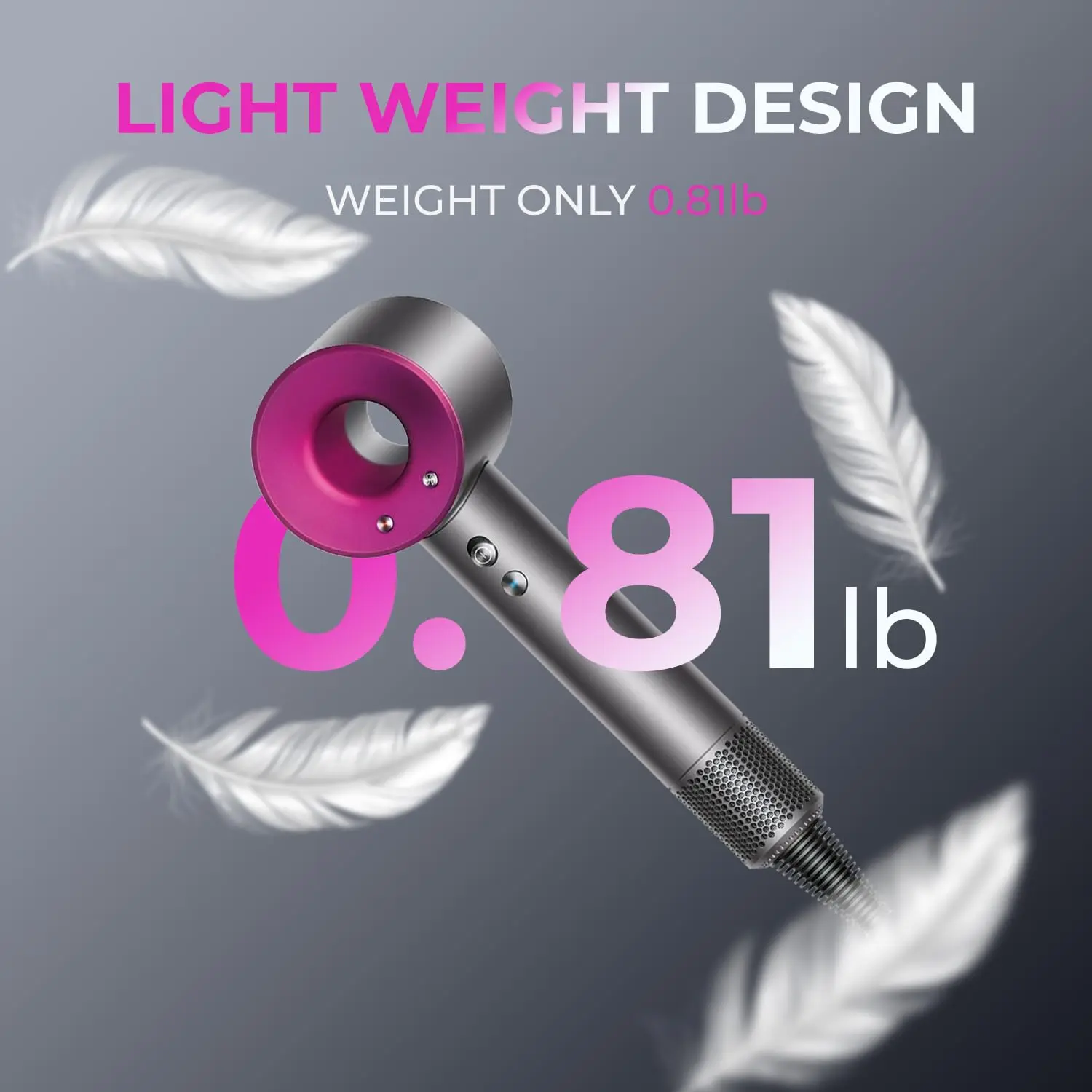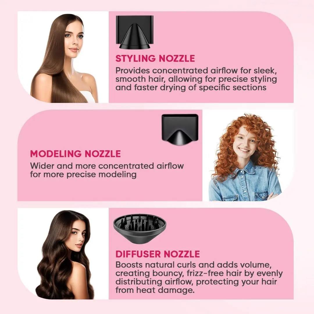 Achieve salon-quality results at home with this Professional Hair Dryer. Experience professional styling versatility with included magnetic attachments: a diffuser for enhancing natural curls and reducing frizz, and a concentrator nozzle for sleek, smooth straightening. Switch between attachments in just 4 seconds for seamless style transitions. This compact and lightweight hair dryer, weighing only 400g, is designed for comfortable, extended use and effortless portability, making it your perfect travel companion. Enjoy a powerful yet quiet drying experience thanks to its innovative 8-layer damping and noise-reduction technology, operating at under 52 dB. Perfect for both professionals and home users, it features 3 speed settings, hot and cool settings to cater to various hair types and desired styles. The included nozzles further enhance styling possibilities by providing optimal control over airflow. Give the gift of beautiful hair for any special occasion. This professional hair dryer is ideal for achieving a variety of hairstyles, from bouncy curls to sleek, straight looks, all while minimizing noise and maximizing convenience. Its lightweight design ensures comfort even during longer styling sessions, and its compact size makes it easy to pack for travel. The hot and cold settings offer precise control, allowing you to customize your drying experience based on your hair type and desired style.