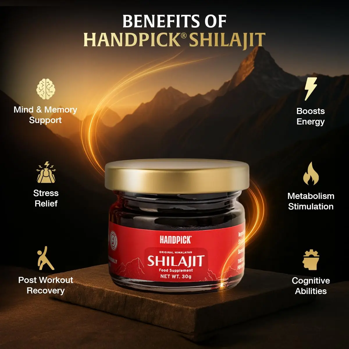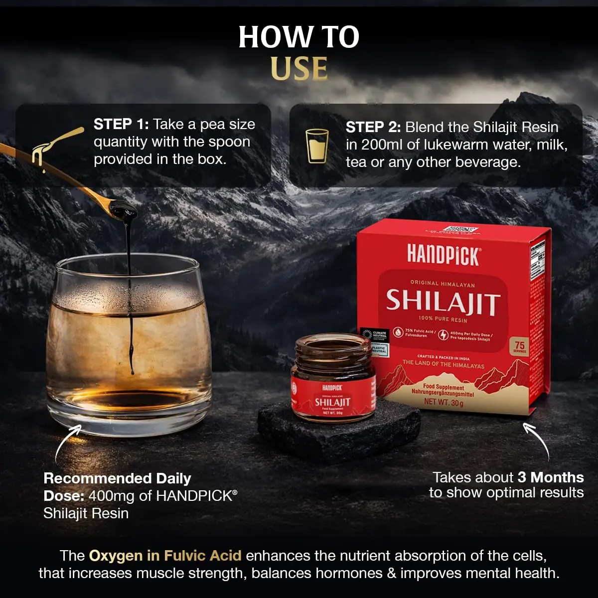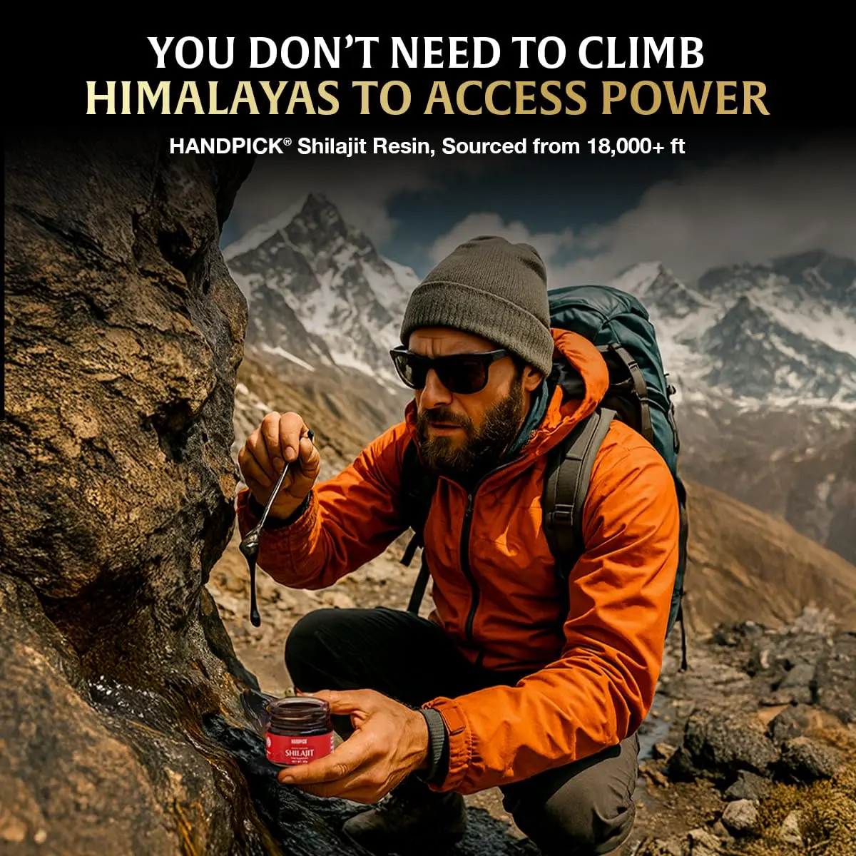 Experience the power of pure Himalayan Shilajit Resin. Sourced from the untouched heights of the Himalayas, our shilajit is a potent natural resin cherished for its remarkable health benefits and rich mineral content. Harvested at high altitudes, our premium shilajit undergoes rigorous quality checks to guarantee its purity and authenticity. We are committed to delivering the highest quality shilajit, packed with essential nutrients to support your overall well-being. Boasting an impressive 75% fulvic acid content, each serving delivers a concentrated dose of this vital compound, known for its antioxidant and anti-inflammatory properties. Our shilajit is naturally rich in trace minerals that are naturally sourced and contribute to the overall quality and composition of the product. We carefully handpick and meticulously pack our shilajit in India, reflecting our unwavering commitment to quality and sustainability. As a certified climate-neutral and plastic-neutral brand, we are dedicated to minimizing our environmental impact and providing you with an eco-friendly choice. We measure our overall carbon and plastic footprint and offset it via investments in environment sustainability initiatives in India. Authenticity is paramount to us. Our shilajit is crafted with ingredients meticulously sourced from pristine Indian landscapes, combined with age-old traditional methods. We present it to you in the most convenient way possible, allowing you to seamlessly upgrade your wellness routine without any artificial flavors, additives, colors, or preservatives. Embrace the ancient wisdom of Ayurveda and unlock the potential of Himalayan Shilajit to revitalize your body and mind. Our product promotes energy, vitality, and overall well-being.