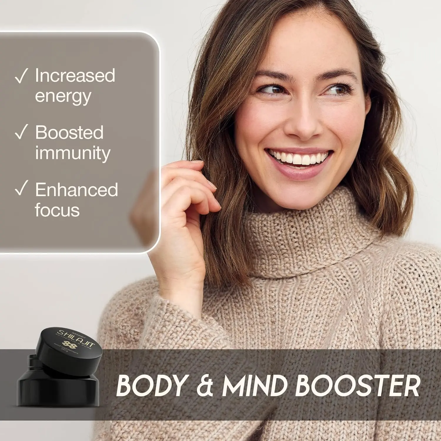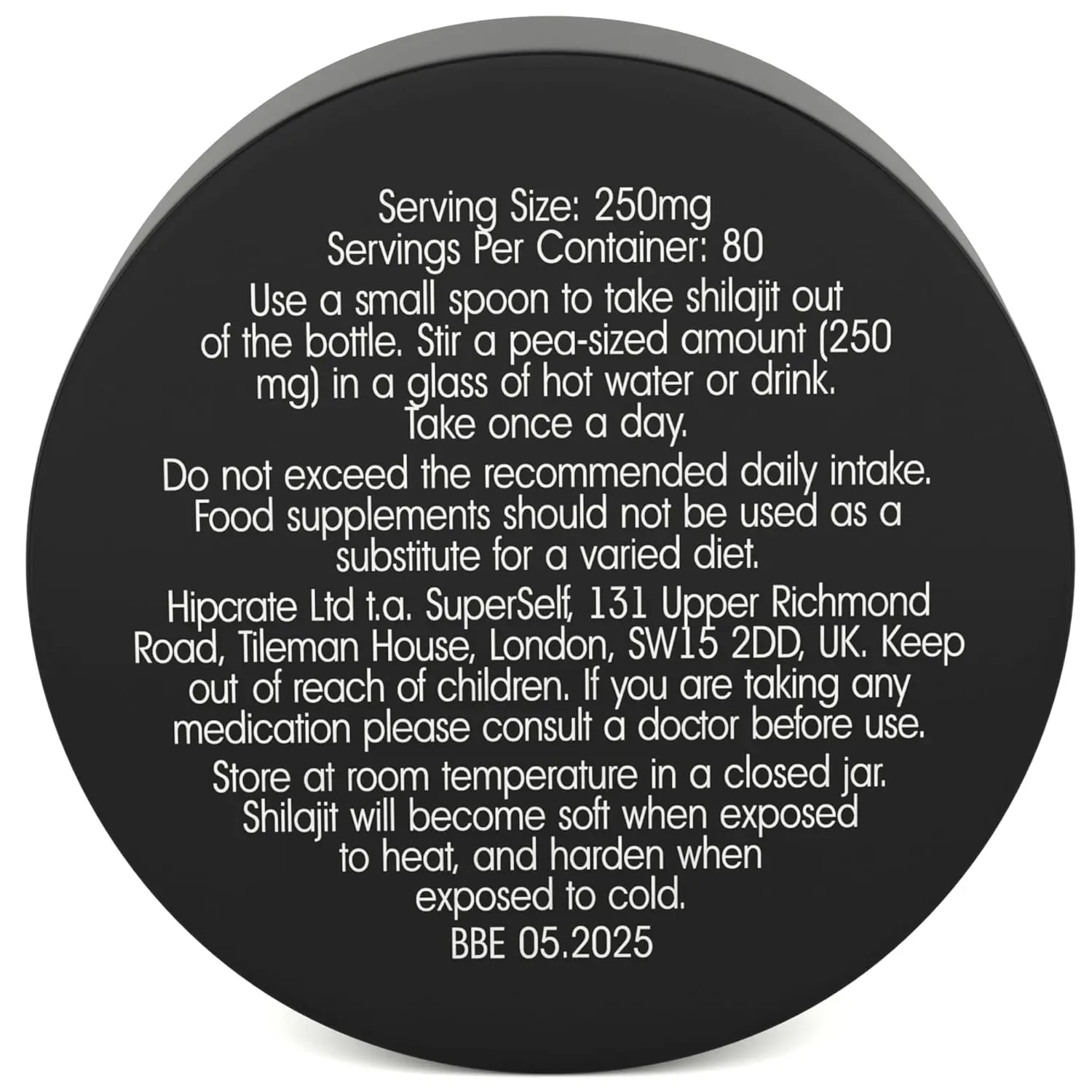 20g jar of natural, purified shilajit resin (200 servings). Ethically harvested and rich in minerals, fulvic & humic acids. Vegan-friendly and easily dissolves.