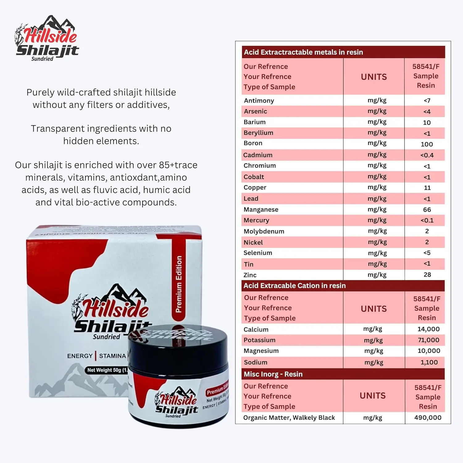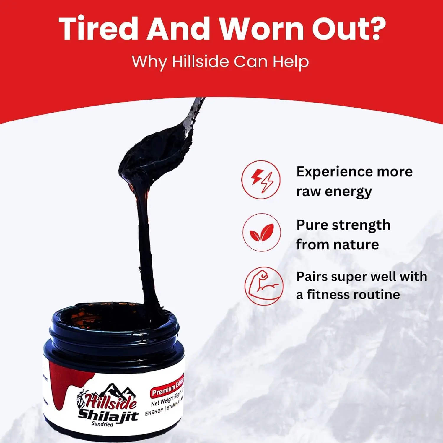 Unleash your peak performance with our Pure Shilajit Resin, rigorously tested in labs and endorsed by expert doctors. This potent resin is your natural ally for amplified stamina, strength, power, and robust immunity. Experience the transformative benefits of Shilajit Resin, supporting the development of healthy, mineral-rich bone marrow. This crucial process facilitates the production of healthy blood cells, vital for the efficient transportation of oxygen and essential nutrients throughout your entire body. Our Hillside Shilajit goes beyond the ordinary, actively reducing stress levels and promoting restful sleep. Enhance your endurance and unlock sustained energy. Furthermore, it champions a healthy metabolism, ensuring you remain in optimal health. Embrace the power of Shilajit for a revitalized you, fortified against daily challenges and brimming with vitality. Feel the difference as your body receives the vital support it needs to thrive. It not only supports physical wellbeing but mental wellbeing too, leading you to feel calm and collected.
