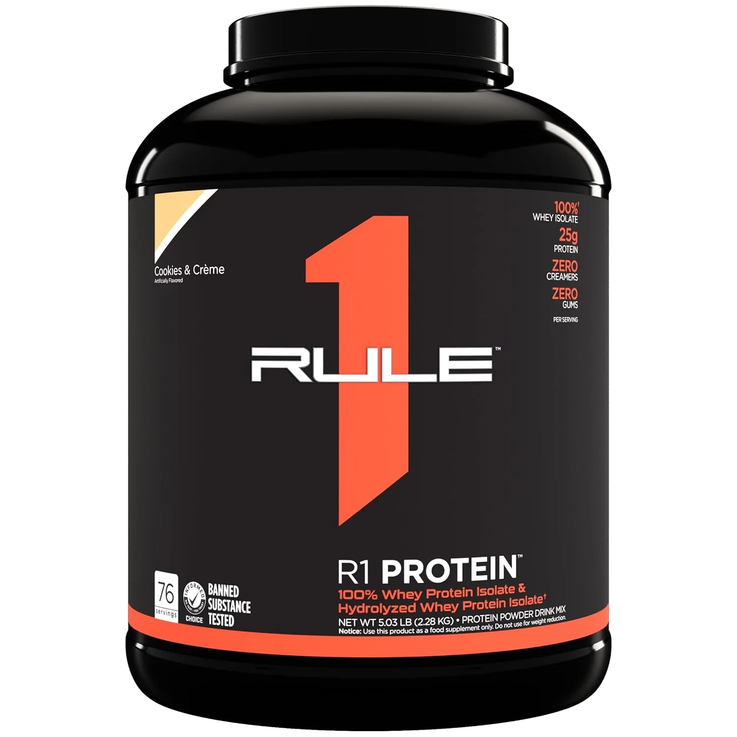 Fuel your fitness journey with R1 Protein Cookies & Crème, a premium whey isolate protein powder designed for athletes and fitness enthusiasts seeking optimal muscle recovery and growth. Each serving delivers 25 grams of pure, fast-acting protein from 100% whey isolate and whey hydrolysate, ensuring rapid absorption and efficient muscle repair. We’ve packed over 6 grams of Branched-Chain Amino Acids (BCAAs) into every scoop to further support muscle protein synthesis and reduce muscle soreness. R1 Protein is meticulously crafted without any whey concentrates, creamers, gums, amino spiking, or other unnecessary fillers. You get only the purest protein sources, without sacrificing the rich, delicious taste of Cookies & Crème. This anytime formula seamlessly integrates into your daily routine. Enjoy it first thing in the morning to kickstart your metabolism, pre-workout for sustained energy, or immediately post-workout to replenish depleted muscle glycogen stores. It also makes a satisfying snack between meals or even a guilt-free treat. R1 Protein is proudly manufactured in our own state-of-the-art, GMP-certified facilities right here in the USA, adhering to the strictest quality control standards. We guarantee a clean product, free from banned substances. Available in a variety of sizes, this 76-serving container provides a long-lasting supply of your favorite Cookies & Crème flavor. Experience the difference of super-pure, fast-acting protein with R1 Protein – the ultimate choice for achieving your fitness goals.