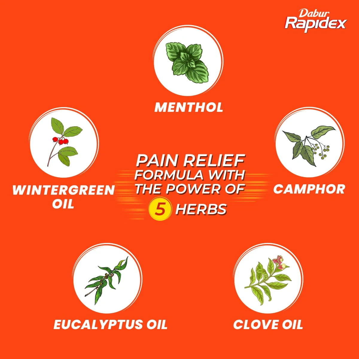• Combined Power of 5 Herbs: Menthol, Wintergreen oil, Camphor, Eucalyptus oil & Clove oil.