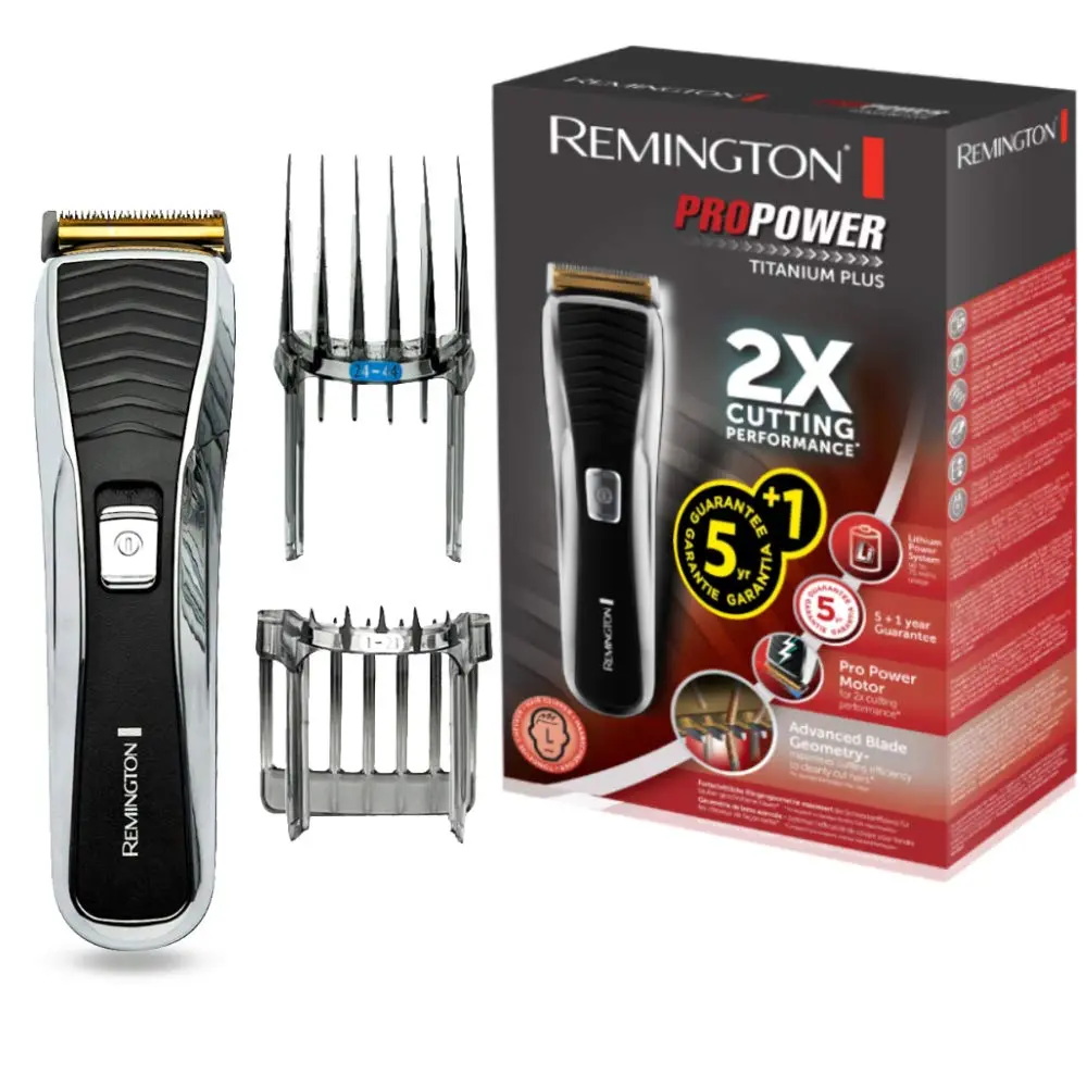 Experience professional-grade haircuts at home with the Remington Pro Power Titanium Hair Trimmer. Featuring AcuAngle blades, Lithium Power, and SlideSelect combs for precision and power.