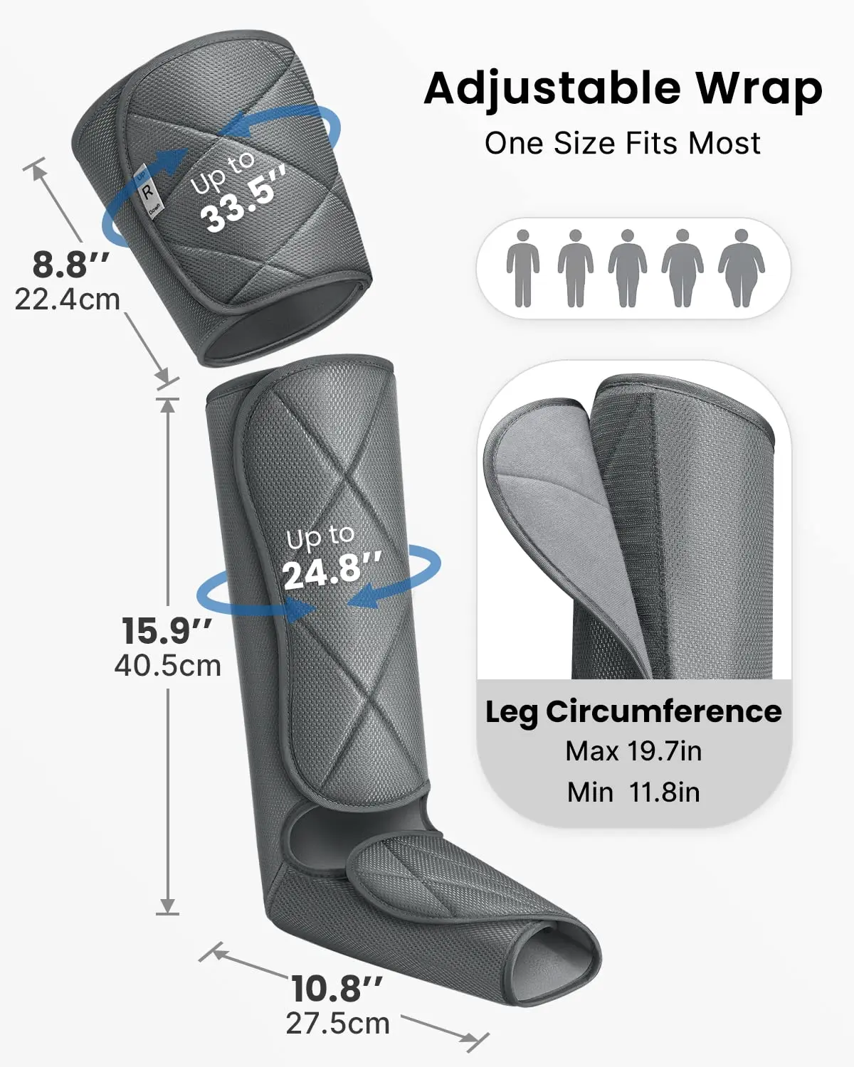The adjustable wrap design ensures a perfect fit for any size. Simply use the Velcro straps to customize the fit to your legs. The calf wraps accommodate circumferences up to 24.8 inches, fitting calves from 11.8 inches to 19.7 inches. The thigh wraps can accommodate circumferences up to 33.5 inches.
