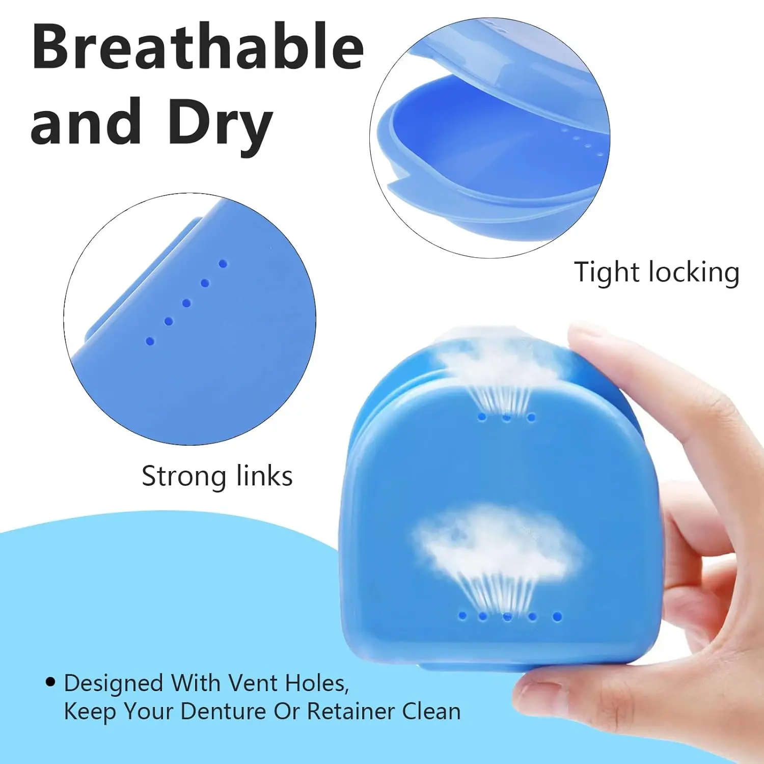 • Ventilation holes keep oral appliances dry and clean.