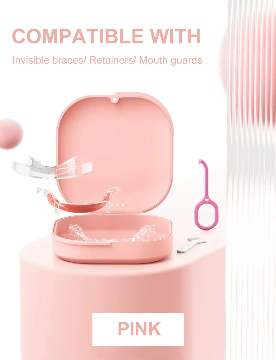 The built-in magnetic closure provides a secure and reliable seal, preventing accidental openings and keeping your aligners safe and protected. We’ve also included a convenient retainer removal tool to help you easily and hygienically remove your aligners. A cleaning brush is also included for keeping your appliances fresh. The sleek and stylish pink color adds a touch of personality to your oral care routine. This little case is the perfect cute home for all of your retainers and aligners. It is light and small and easy to carry!