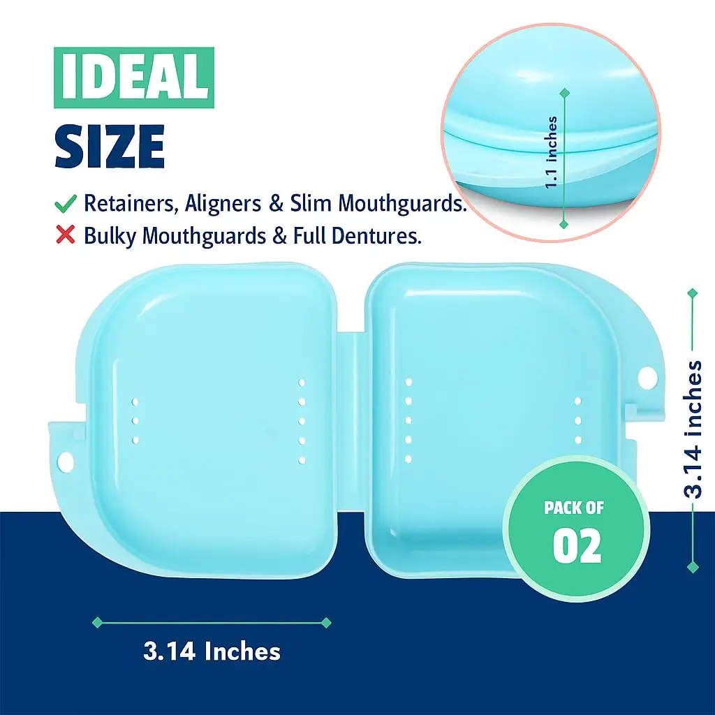 Keep your aligners, retainers, and mouthguards fresh and protected with our innovative retainer case! Unlike ordinary cases that quickly develop unpleasant odors, our retainer holder is crafted from high-quality, food-grade PP plastic. This durable material is naturally odorless and resistant to bacterial growth. The ingenious design incorporates strategically placed vent holes to promote airflow, effectively preventing moisture buildup and keeping your oral appliances clean and non-smelly. The secure, tight-fitting plastic closure provides a reliable seal, far superior to flimsy magnetic closures. You can confidently toss this case in your bag or pocket without worrying about leaks or spills. Its compact and lightweight design makes it perfect for home, office, travel, and on-the-go use. Each set includes two bluish-colored cases, providing ample space to store your aligners, retainers, whitening trays, dentures, or night guards. Cleaning is a breeze – simply place the case on the top rack of your dishwasher or wash it with warm water and dish soap. Invest in the ultimate solution for oral appliance storage and enjoy a fresh, clean, and odor-free experience!