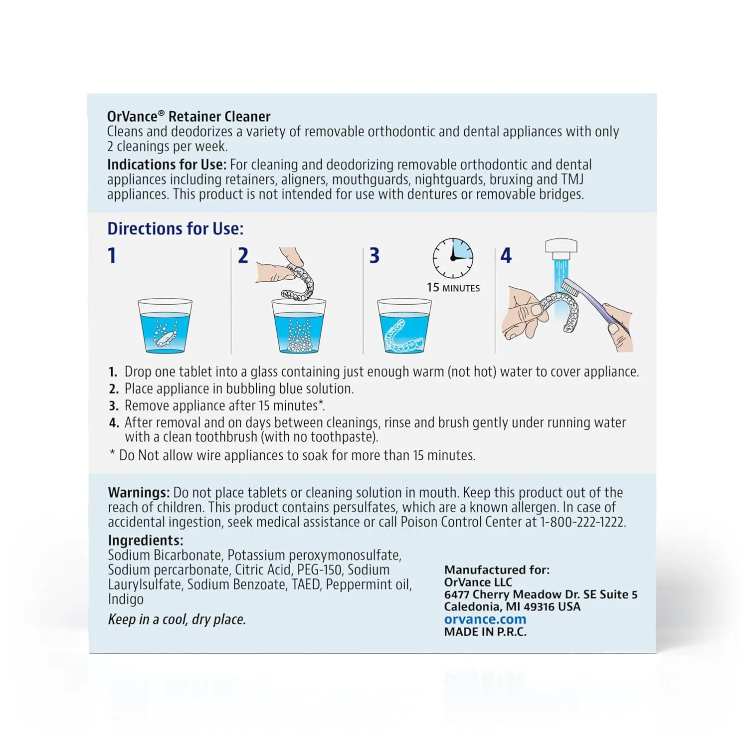 Keep your removable dental appliances sparkling clean and fresh with Retainer Cleaner Tablets. This powerful cleaner effectively removes plaque, odors, and stains from clear aligner trays, retainers, dental guards, mouth guards, and dentures with just two cleanings per week. Unlike other cleaners that require daily use, Retainer Cleaner offers a convenient and time-saving solution for maintaining optimal oral hygiene. In just 15 minutes, our specially formulated tablets dissolve quickly in water to provide a deep and thorough clean. Eliminate the hassle of daily scrubbing and soaking, and experience a cleaner, brighter, and fresher appliance with Retainer Cleaner. Brushing and rinsing alone can’t remove the stubborn build-up of plaque that accumulates from everyday use. Our tablets are an effective Invisalign cleaner, targeting and removing plaque that causes discoloration and bad breath. Protect your investment in orthodontic treatment and maintain a confident smile. Retainer Cleaner is the perfect solution for teens who may struggle with consistent hygiene routines. The simple and quick cleaning process makes it easy for them to keep their appliances fresh and clean with minimal effort. Each box contains a 3-month supply of 28 tablets, offering unbeatable value compared to other cleaners. Save time, save money, and enjoy a superior clean with Retainer Cleaner. Don’t let stains and odors compromise your smile or the effectiveness of your orthodontic treatment. Trust Retainer Cleaner to keep your retainers, aligners, dentures, and mouthguards in pristine condition, so you can confidently wear them every day.