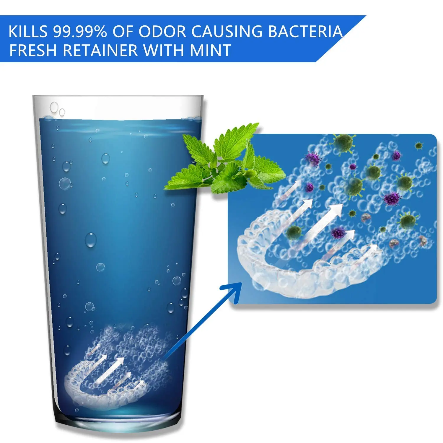 Achieve a 360-degree deep clean for your orthodontic appliances with our powerful retainer cleaning tablets! These tablets are the most effective solution on the market, quickly and easily removing stains, plaque, and odors. Simply immerse your retainer, Invisalign, or other appliance into a blue bubble soak created by the tablet, and within just 15 minutes, it will be thoroughly cleaned and refreshed.