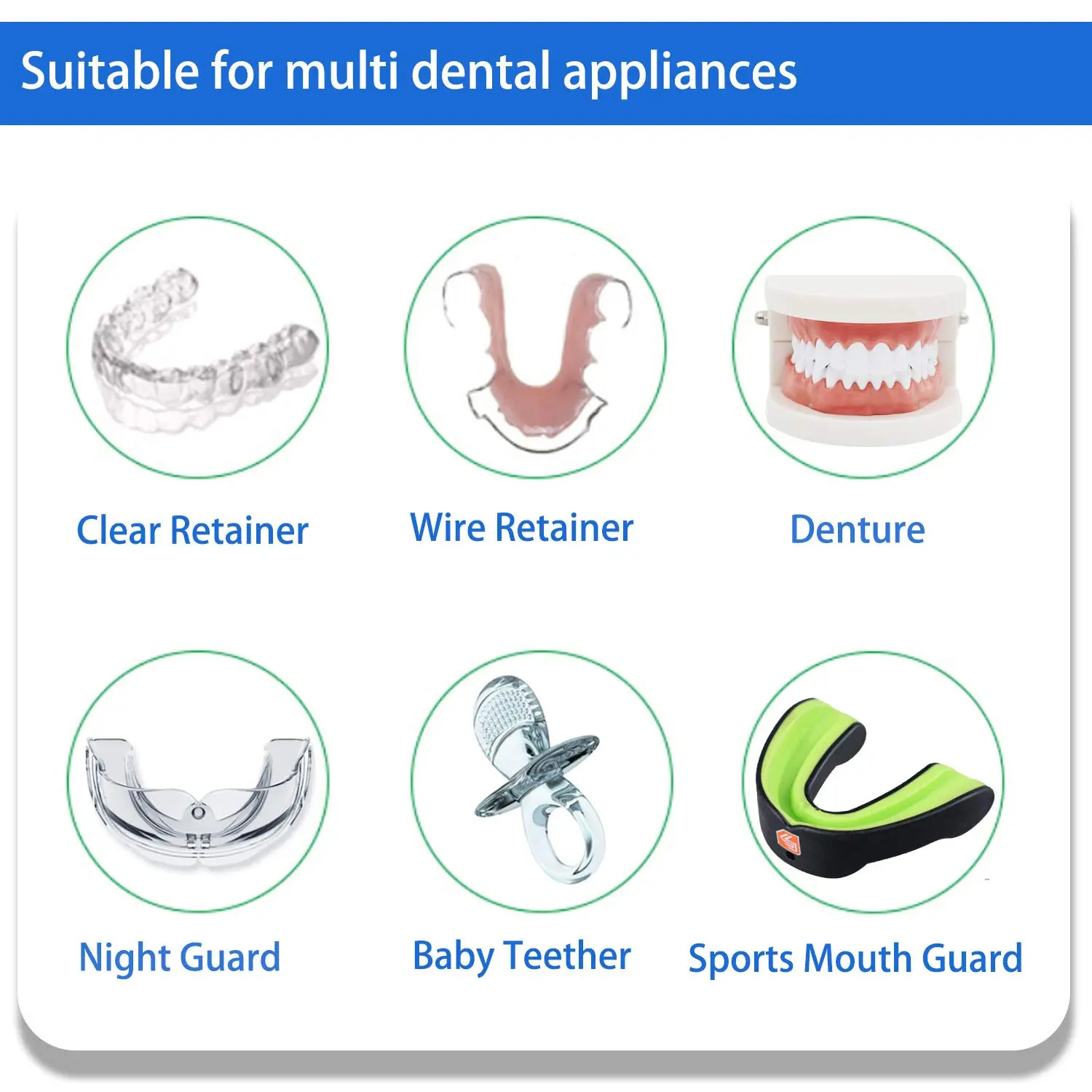 Our versatile cleaner is suitable for a wide range of appliances, including retainers, Invisalign aligners, mouthguards, wire appliances, removable bridges, baby teethers, night guards, aligner chewies, Bruxing appliances, and TMJ appliances. Keep all your oral devices sparkling clean and hygienic with our convenient and effective cleaning tablets.