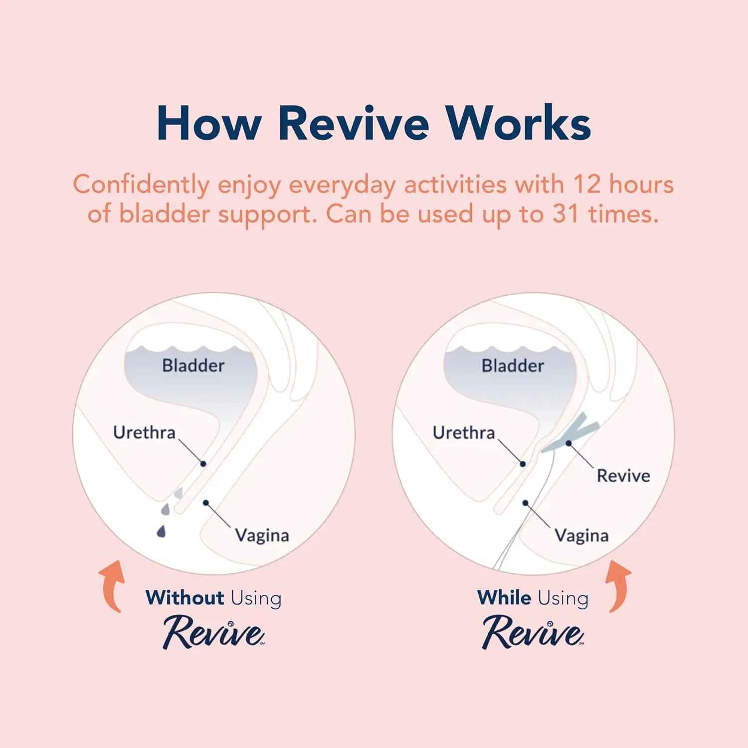 Are you tired of light bladder leaks holding you back? Revive offers a revolutionary approach to bladder support, helping you regain confidence and control. This innovative product is designed to prevent leaks from the inside, providing discreet and comfortable protection for up to 12 hours a day. Whether you’re experiencing postpartum issues, dealing with prolapse, or simply struggling with light bladder leakage, Revive can help you live life to the fullest without the worry of embarrassing accidents. Say goodbye to bulky pads and hello to a new level of freedom and comfort with Revive. It’s easy to use, discreet enough to be unnoticeable, and designed to fit most women comfortably. Reclaim your active lifestyle and rediscover the joy of feeling dry and confident all day long. Don’t let light bladder leaks dictate your life any longer. Choose Revive and experience the difference! With Revive, you can confidently participate in your favorite activities, from exercising and traveling to simply enjoying time with family and friends, without the constant worry of leaks. Regain your peace of mind and embrace a more carefree you. The discreet design ensures that no one will ever know you’re wearing it, allowing you to maintain your privacy and confidence. Plus, the easy-to-use applicator makes insertion and removal a breeze.