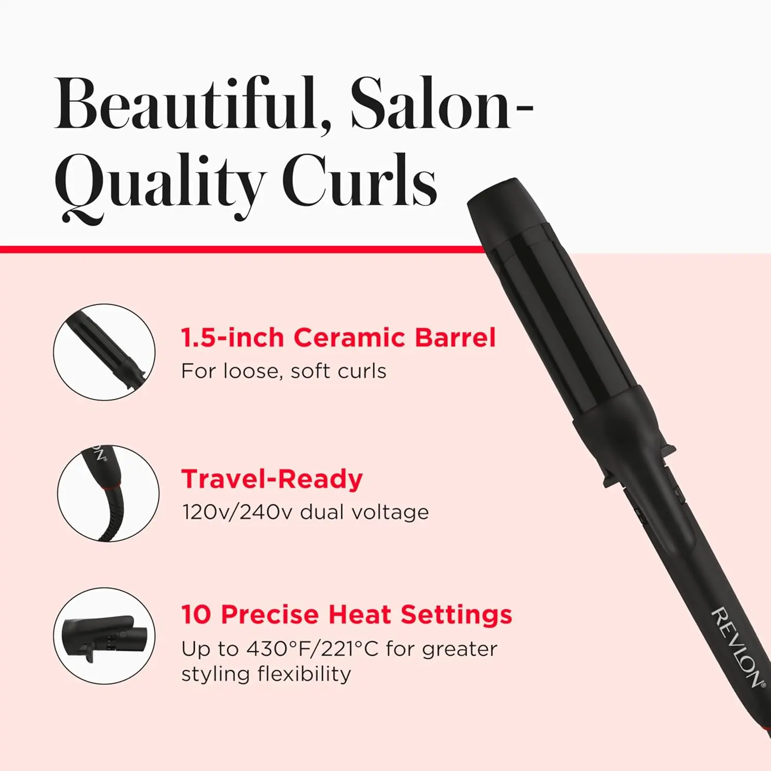 Customize your styling experience with 10 precise heat settings, reaching up to 430°F, making it suitable for all hair types, from fine and delicate to thick and coarse. Whether you desire loose, soft waves or defined curls, this versatile curling iron delivers effortless results. The travel-ready 120V/240V dual voltage plug ensures you can maintain your signature style wherever you go. Simple yet incredibly versatile, the Revlon SmoothStay Curling Iron features an automatic shut-off function after one hour of non-use, providing peace of mind. A precise temperature display allows for accurate heat control, and an easily accessible on-off button makes operation a breeze.