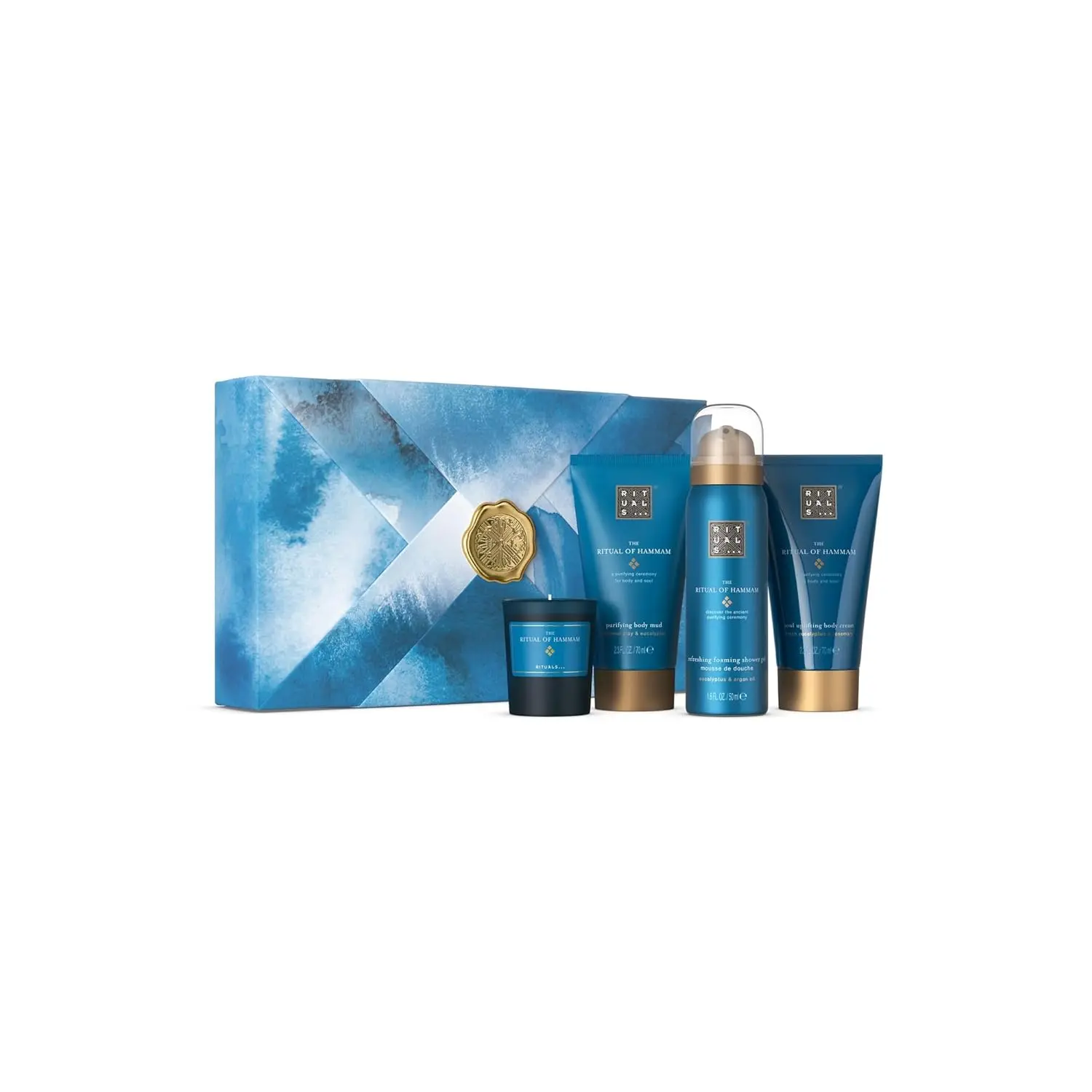 Transform your bathroom into a personal spa with the RITUALS Hammam Gift Set. Inspired by the ancient Turkish cleansing tradition, this set is designed to purify both body and soul, leaving you feeling refreshed and rejuvenated. Experience the invigorating scents of eucalyptus and rosemary or eucalyptus and argan oil as you indulge in a complete cleansing ritual. This set contains four purifying favourites: a luxurious foaming shower gel, a deeply moisturizing body cream, a cleansing body mud, and a beautifully scented candle. Each product works in harmony to create an authentic Hammam experience, awakening your senses and leaving your skin feeling soft, smooth, and revitalized. The carefully wrapped origami gift box makes this set the perfect energizing gift for a friend, family member, or a well-deserved treat for yourself. Discover The Ritual of Hammam and elevate your everyday routine into a moment of mindful self-care. This Rituals gift set helps to purify body and soul with its purifying, refreshing fragrance, according to one of the oldest cleansing traditions in the world. Sharpen your senses with this Rituals gift set containing 4 purifying favorites that help transform your bathroom into a spa and cleanse you from head to toe. Each product in this body care set features either the refreshing scent of eucalyptus and rosemary, or eucalyptus and argan oil, making you feel like you’re in an authentic Turkish steam bath.