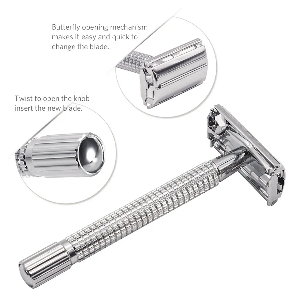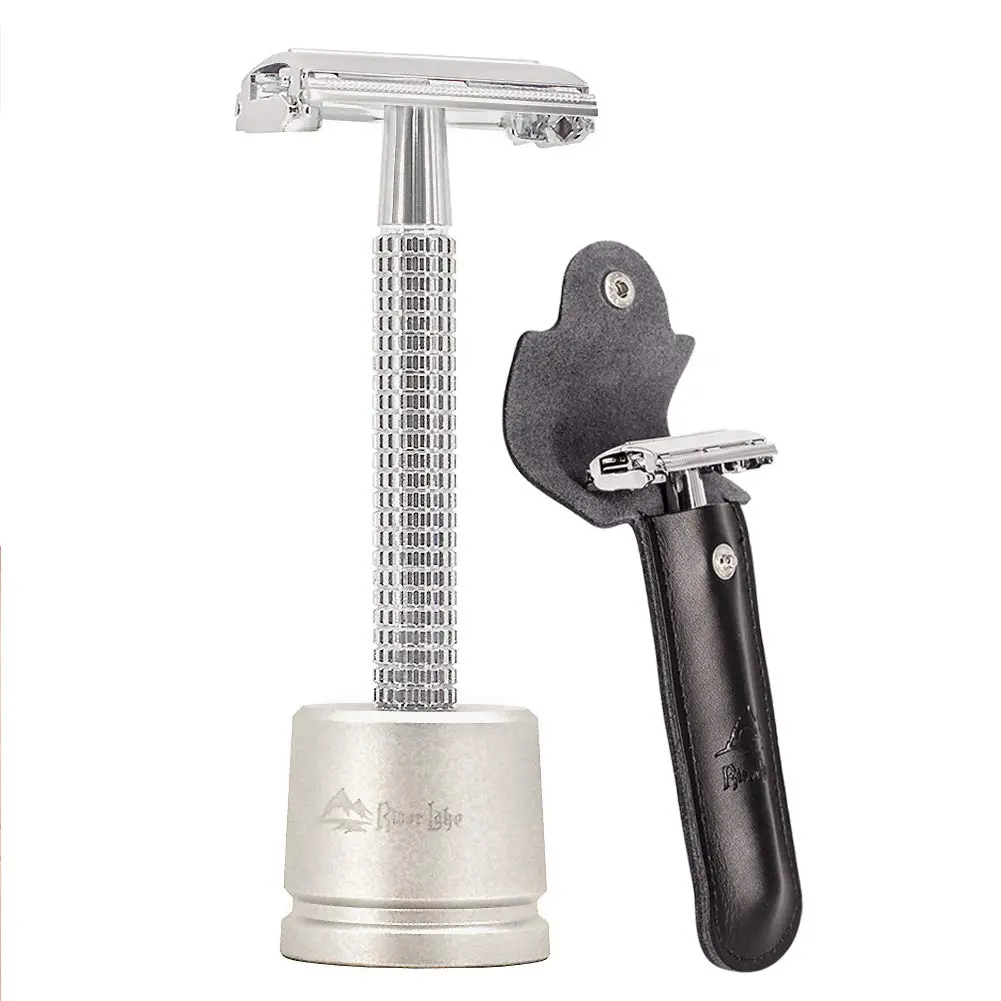 Experience the closest, most comfortable shave with the River Lake Safety Razor Kit. This meticulously crafted kit includes everything you need for a classic shaving experience. The safety razor features a 4.33-inch anti-slip long handle, providing excellent grip and control. Constructed from high-quality alloy material, this razor is built to last and will never rust. The innovative butterfly open design allows for quick and easy blade changes without the risk of cutting yourself. Simply twist to open, replace the blade, and twist to close. The included razor stand is crafted with an aluminum finish, making it impervious to water and perfect for keeping your razor clean and dry. The genuine leather case provides ultimate protection for your razor while traveling, preventing scratches and ensuring it stays in pristine condition. This double-edge razor is easy to use, trustworthy, and utilizes a traditional patented “butterfly” opening mechanism for quick and safe blade changes. This comprehensive kit is ideal for both beginners and experienced wet shavers looking for a high-quality and reliable shaving solution. The River Lake Safety Razor Kit delivers a smooth, irritation-free shave every time. Its durable construction and thoughtful design ensure that this kit will be a staple in your grooming routine for years to come. Enjoy the art of traditional shaving with the River Lake Safety Razor Kit and achieve a perfectly groomed look with ease. This safety razor is your best solution for shaving.