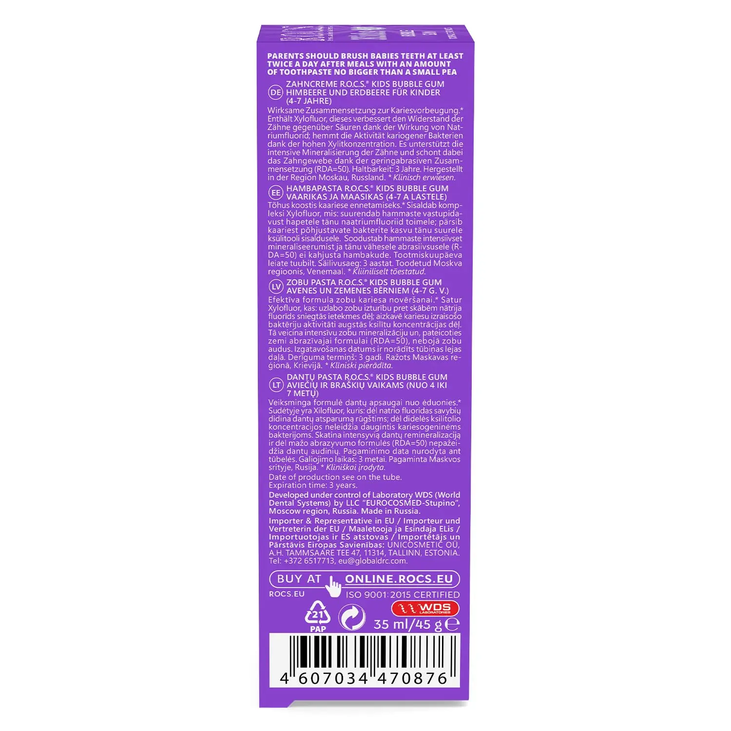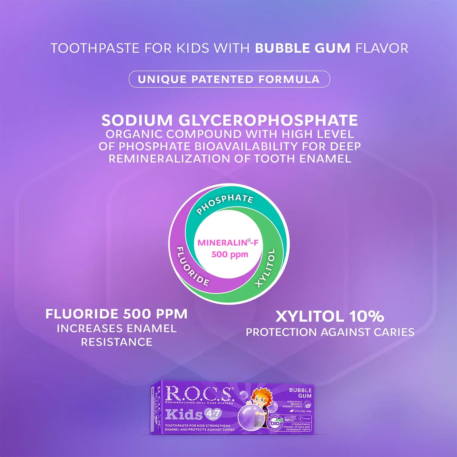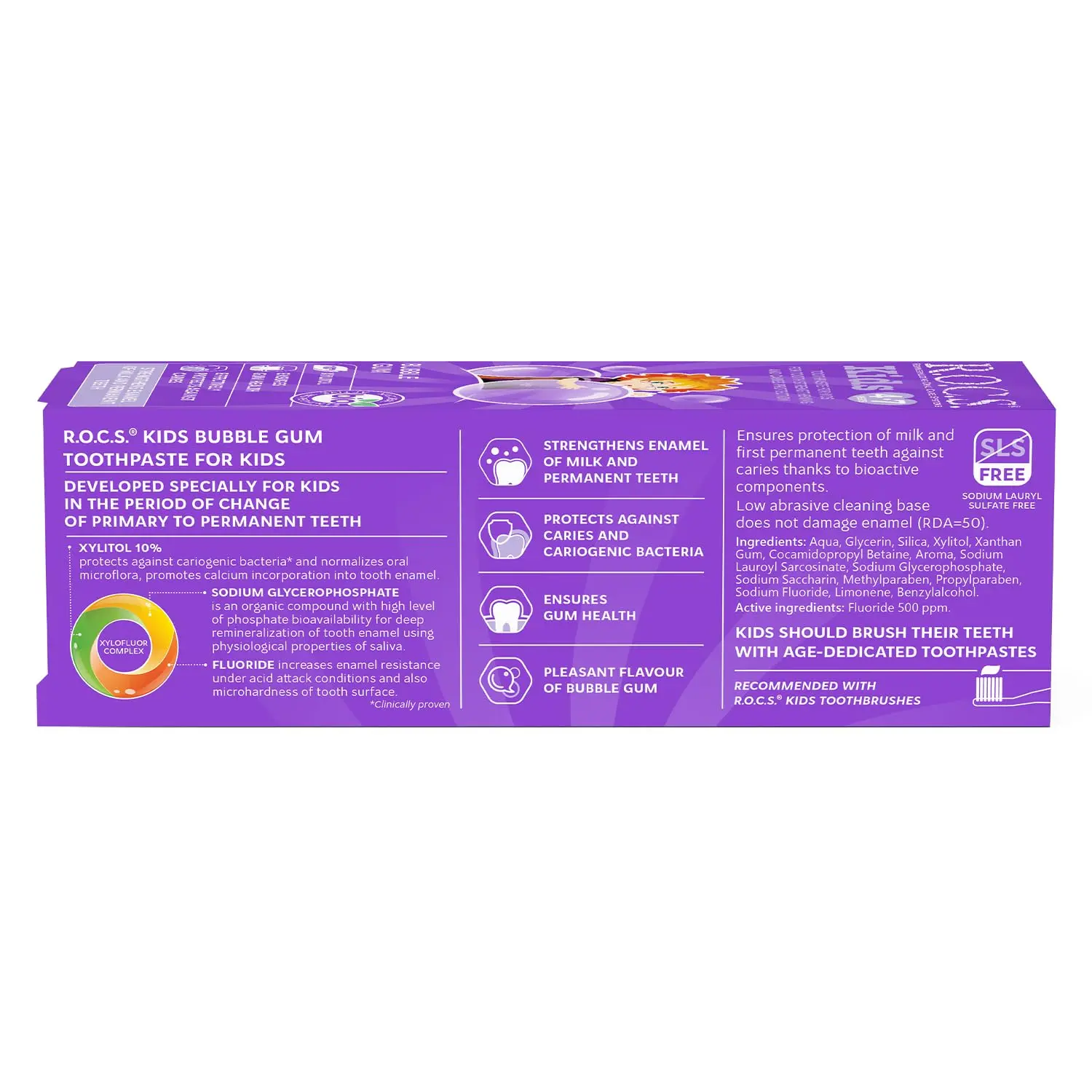ROCS Kids Bubble Gum Toothpaste provides superior protection for your child’s developing smile. Formulated with 500 ppm fluoride, this toothpaste actively strengthens enamel in both milk and permanent teeth. It significantly increases enamel’s resistance to acid attacks, helping to prevent cavities and maintain optimal oral health. The specially designed formula promotes healthy gums and supports the overall well-being of your child’s mouth. The delightful bubble gum flavor encourages regular brushing, making it a fun and effective way to establish good oral hygiene habits early in life. Give your child the best start with ROCS Kids Bubble Gum Toothpaste, ensuring a strong, healthy, and happy smile. This toothpaste goes beyond basic cleaning, offering advanced enamel protection and gum care. Regular use, as part of a consistent oral hygiene routine, helps build a foundation for lifelong dental health. With ROCS Kids, brushing becomes an enjoyable experience, making it easier to instill positive habits that will benefit your child for years to come. Protect your child’s smile with ROCS Kids Bubble Gum Toothpaste.